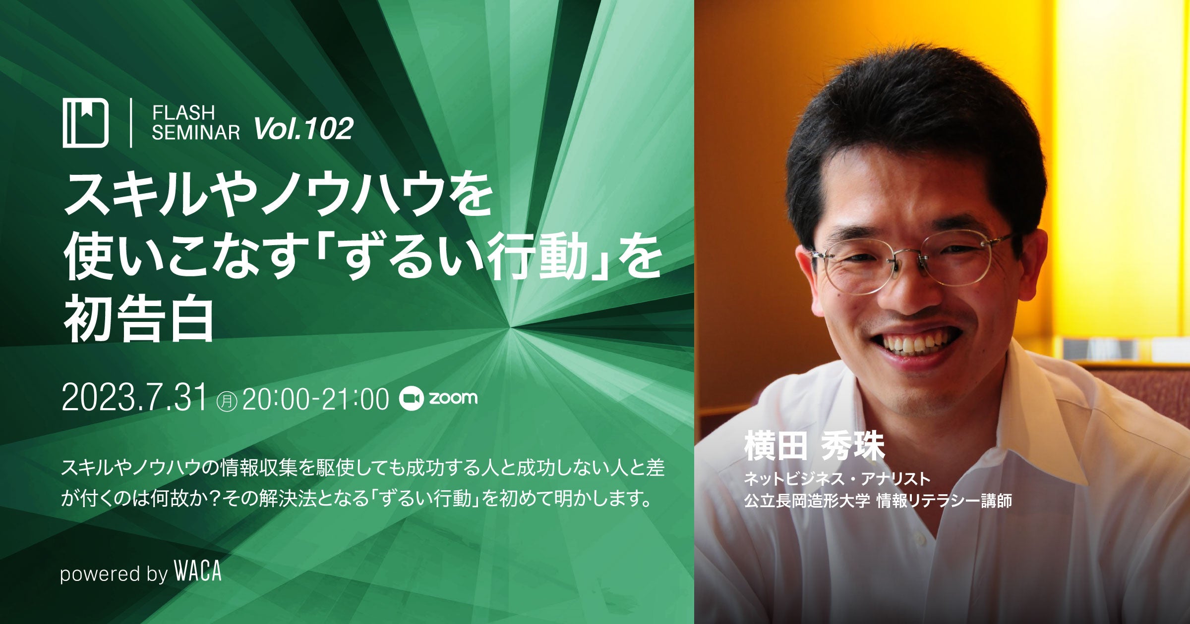 2023/7/31(月)20:00 - 21:00【Flashセミナー】Vol.102【無料】スキルやノウハウを使いこなす「ずるい行動」を初告白 〜ずるい検索 サイドストーリー〜