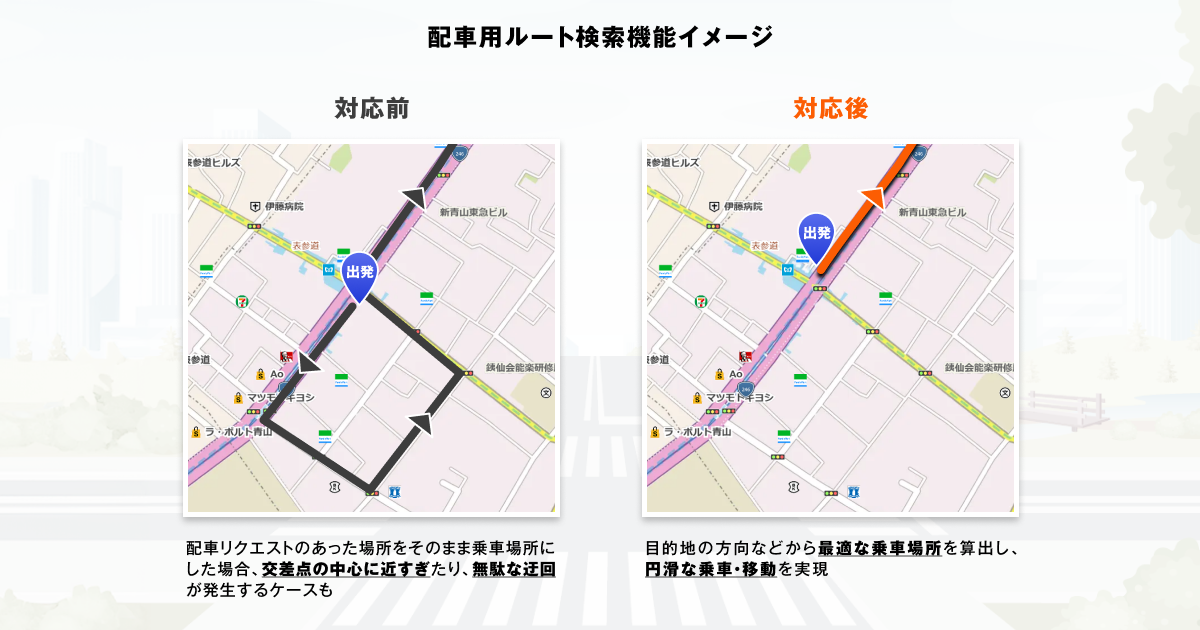 また、デマンド交通では、1つの車両に複数の乗客が異なる地点から乗車するケースも想定されます。そのような場合でも、目的地に向かう進行方向に合わせて、迂回しなくて済む乗車場所を乗客に提案することで、スムーズで効率の良い運行を実現します。