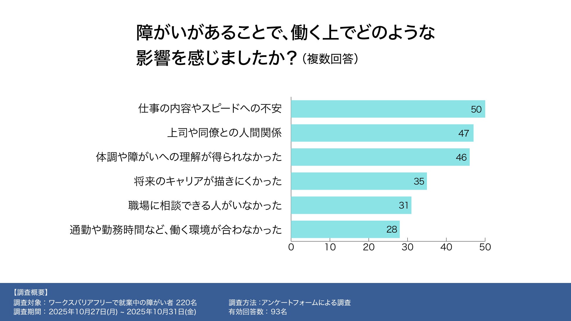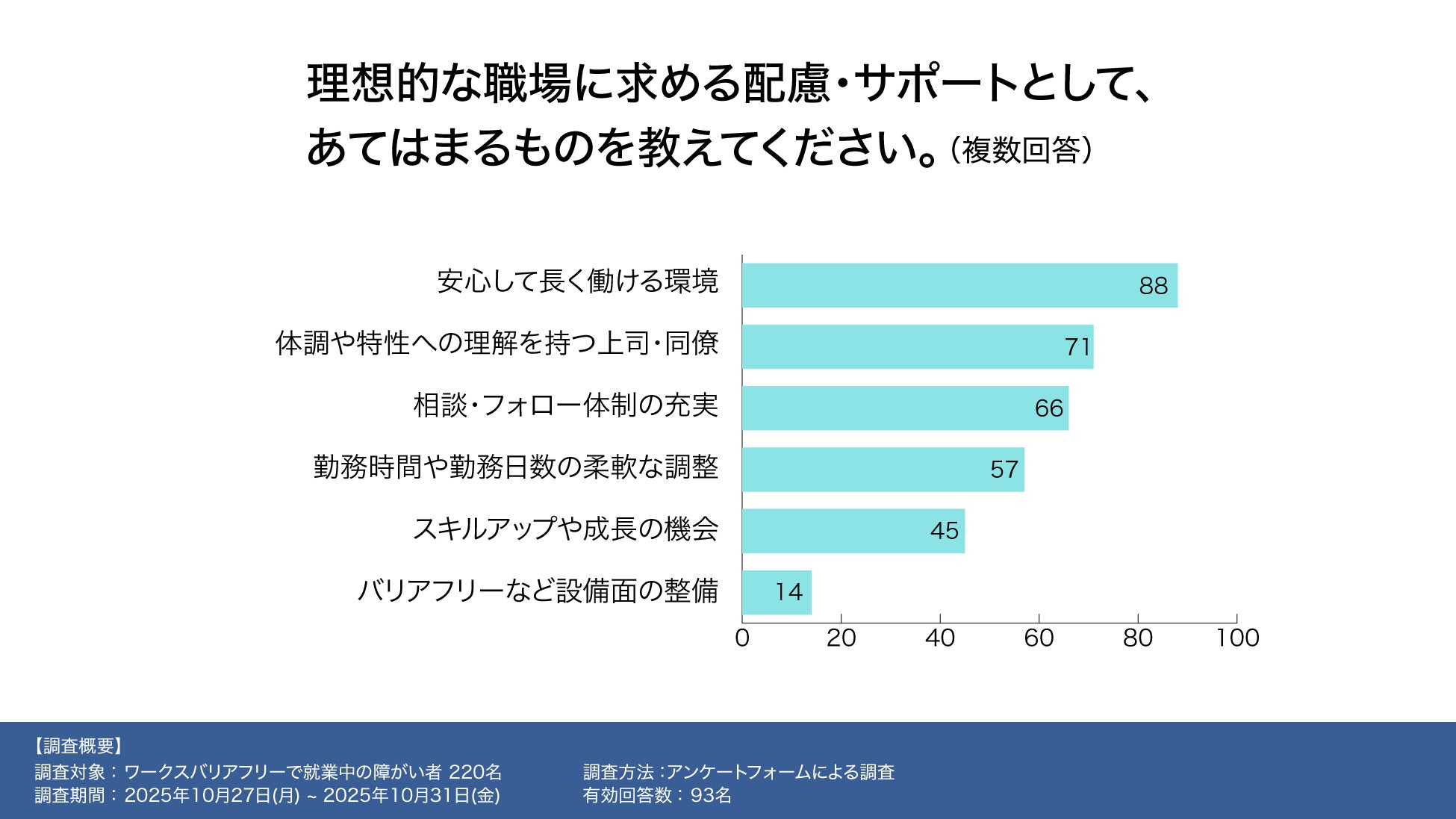 本調査では、障がい者の働きづらさの背景や、より良い就労環境に必要な要素が浮き彫りとなりました。