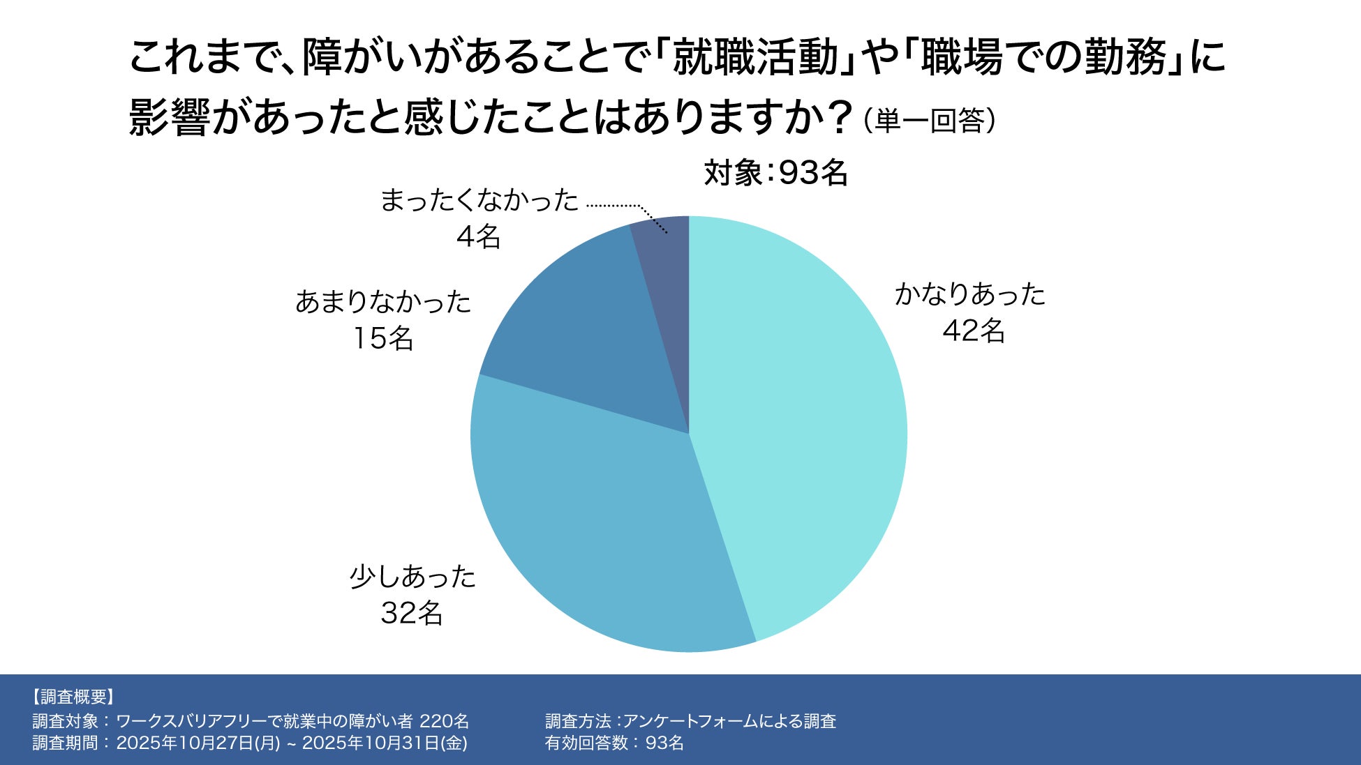 「障がいによる就職・就労への影響」について尋ねたところ、「かなりあった」と回答した人が42名、「少しあった」と回答した人が32名で、全体の79.6%(74名)が“影響があった”と回答。 就職活動や働き方において、障がいにより何らかのハードルを経験している実態が浮き彫りになりました。