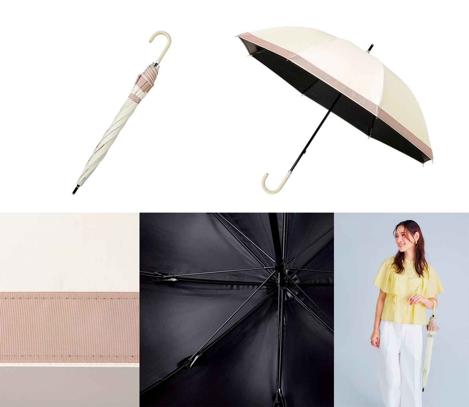 A: UVカット率の高い日傘をさすのももちろん大事。日差しの強い時は、移動中の車内でも傘をさしちゃいます。暑い日は扇風機の付いた日傘を使用したり、2本使いをしたり…。日傘は身近な存在です。