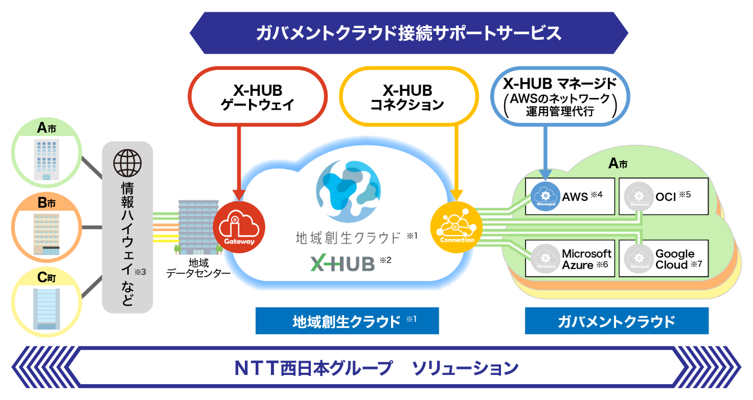 ※2 X-HUB(クロスハブ)は、地域創生クラウドにおいて、西日本エリア(富山県、岐阜県、静岡県以西の30府県)に配備したクラウド基盤(X-EDGE(クロスエッジ))や外部クラウドサービスと連携して、トータルな価値を生み出すサービスの総称です。