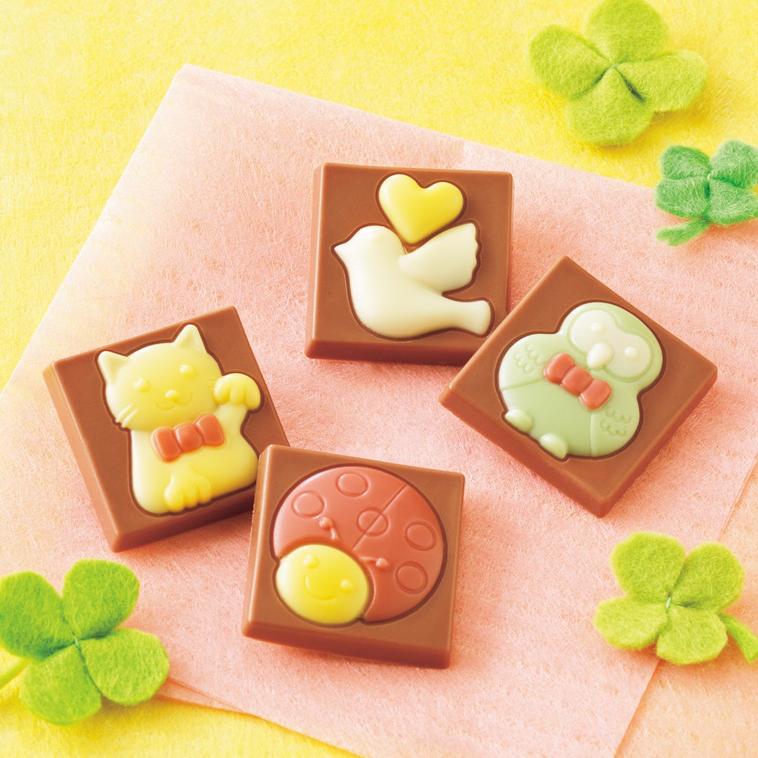 幸運の象徴とされる4つの生き物やアイテムをモチーフにしたひと口サイズのチョコレート。ストロベリー風味のクリームをまろやかなミルクチョコレートで包み、フクロウ・てんとうむし・ハト・招き猫の4種をデザインしました。