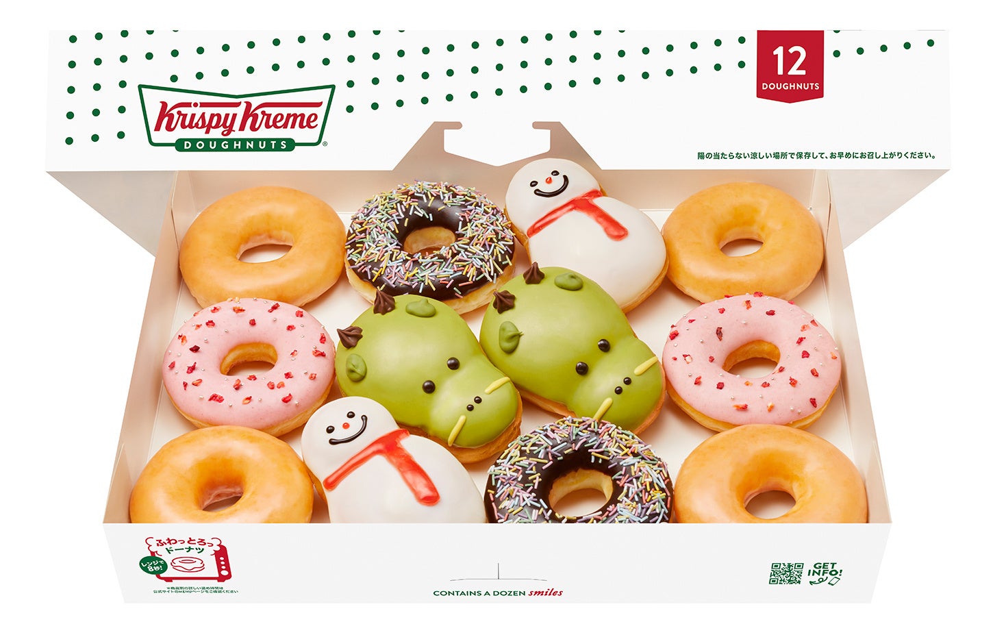 幸運を運ぶドラゴン カスタード、笑顔を呼び寄せるハッピー ストロベリー リング、冬の人気者チョコレート スノーマン。定番のチョコ スプリンクル、オリジナル・グレーズド®が新しいラッキーを届けます。大切な家族や友達と新年をお祝いする12個入りです。