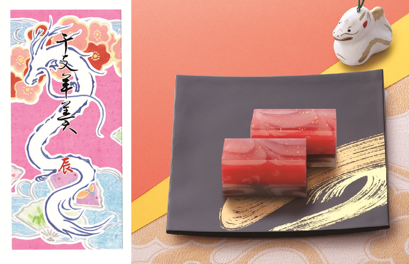 2024年の干支「辰」を描いた期間限定パッケージの小形羊羹です。穏やかな新年をゆったりとお過ごしいただきたいという思いを込めて、大空を舞う龍の姿を配しました。干支パッケージ小形羊羹「夜の梅」「おもかげ」各4点、「新緑」2点を詰め合わせました。