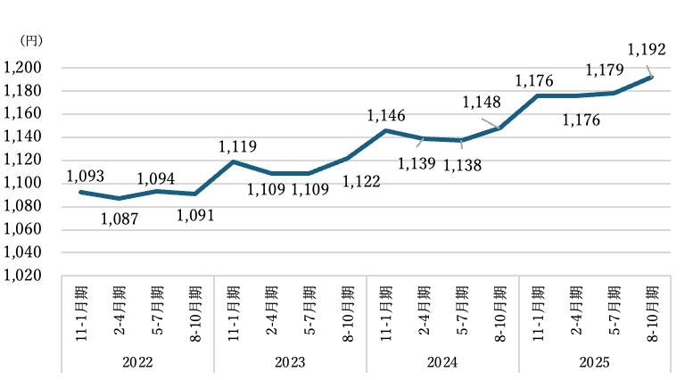 ・2025年4Q(2025年8-10月期)の三大都市圏のスポットワーク平均時給は1,192円(前年同期比+3.8%)
