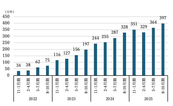 ・2025年4Q(2025年8-10月期)の全国のスポットワーク募集件数は397.2万件(前年同期比+21.2%)