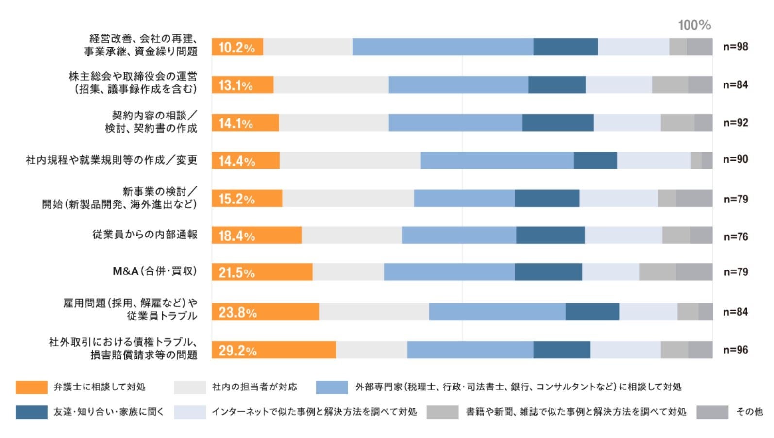 しかしながら2022年4月に当社が行った「中小企業の弁護士活用の実態とニーズ」に関する調査では、法的案件が発生した際、「弁護士以外の外部専門家に相談する」や「友だち・知り合い・家族に聞く」などが多数を占めており、弁護士へ相談するハードルが高い、ということが見て取れます。