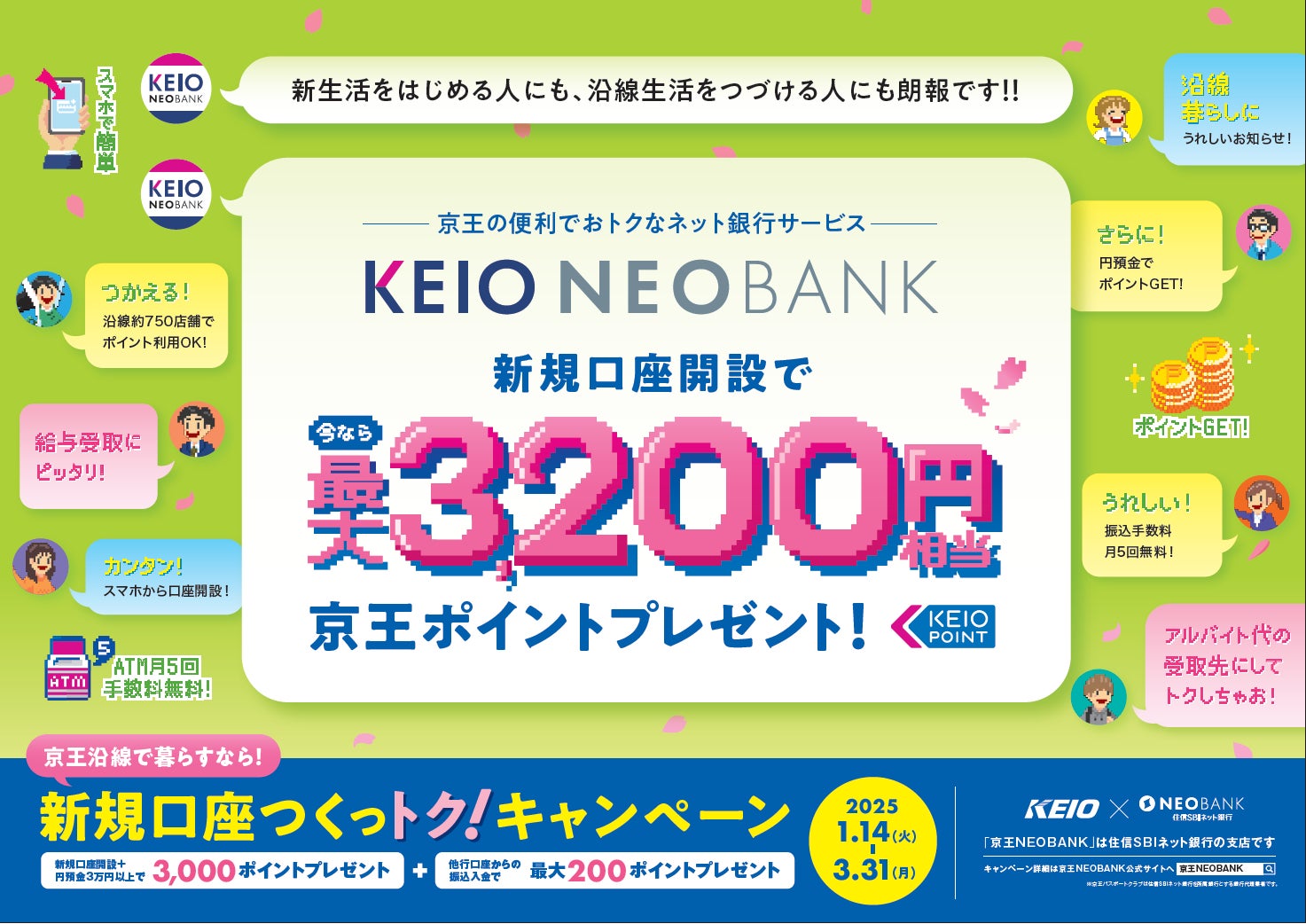 住信SBIネット銀行株式会社(本社:東京都港区、代表取締役社長(CEO):円山 法昭、以下「住信SBIネット銀行」)と、株式会社京王パスポートクラブ(本社:東京都渋谷区、代表取締役社長:安永 克彦、以下「京王パスポートクラブ」)が提供する「京王NEOBANK」にて、2025年1月14日(火)より「新規口座つくっトク!キャンペーン」を開始いたします。
