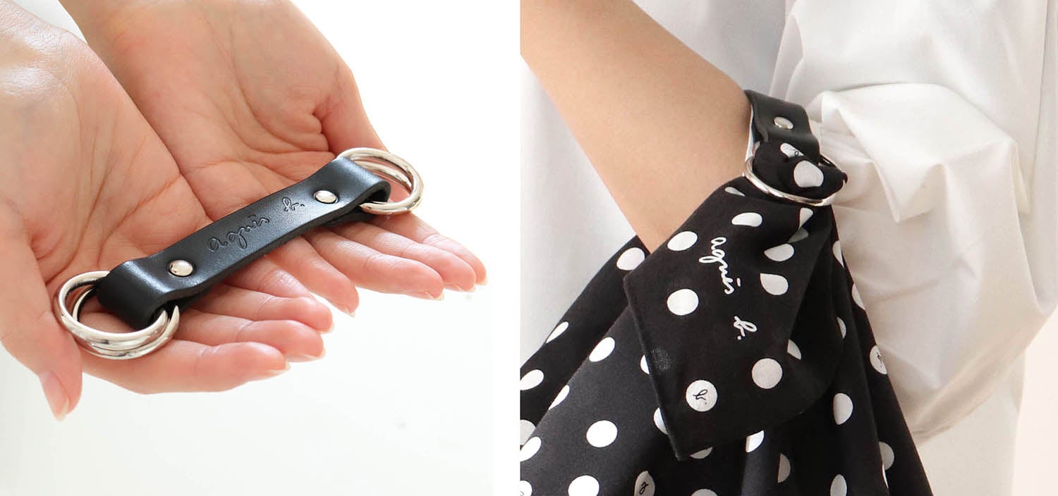 agnès b. のロゴがポイントになった牛革ベルトの風呂敷ハンドは、リングに風呂敷を通すだけで簡単にバッグが作れるので、より洗練されたイメージでご使用いただけます。