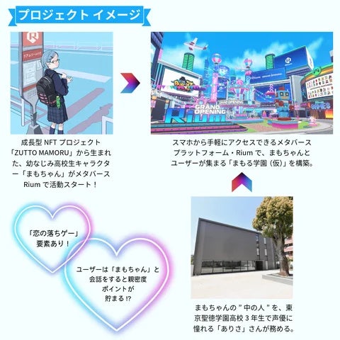 本プロジェクトでは、Riumメタバースとの共同開発により、「ずとまも」から生まれたキャラクター、“まもちゃん” が主役のバーチャル学園シミュレーションゲームを開発していきます。
