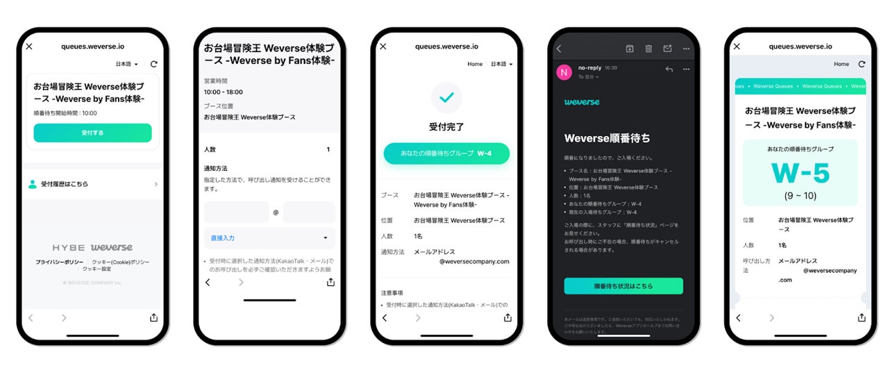 また、本コーナーでは、「weverse順番待ち」サービスを導入しています。weverseアプリをダウンロードしてアカウントを作成した後、ブースでQRコードを読み込み順番待ち受付をすると、3段階で呼び出し通知が届き、長時間並ぶことなくブースに入場することが可能です。