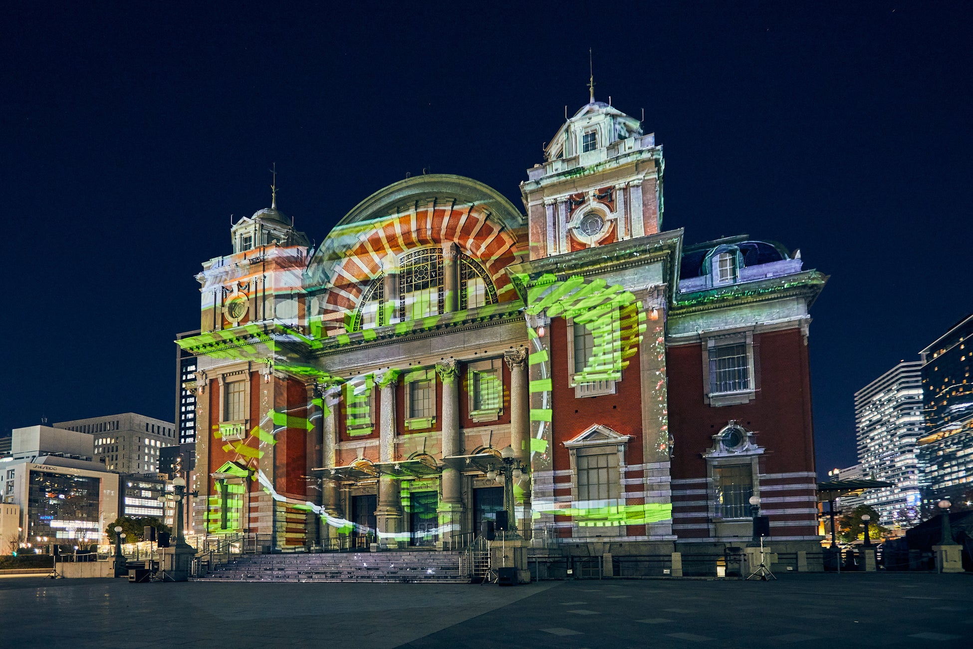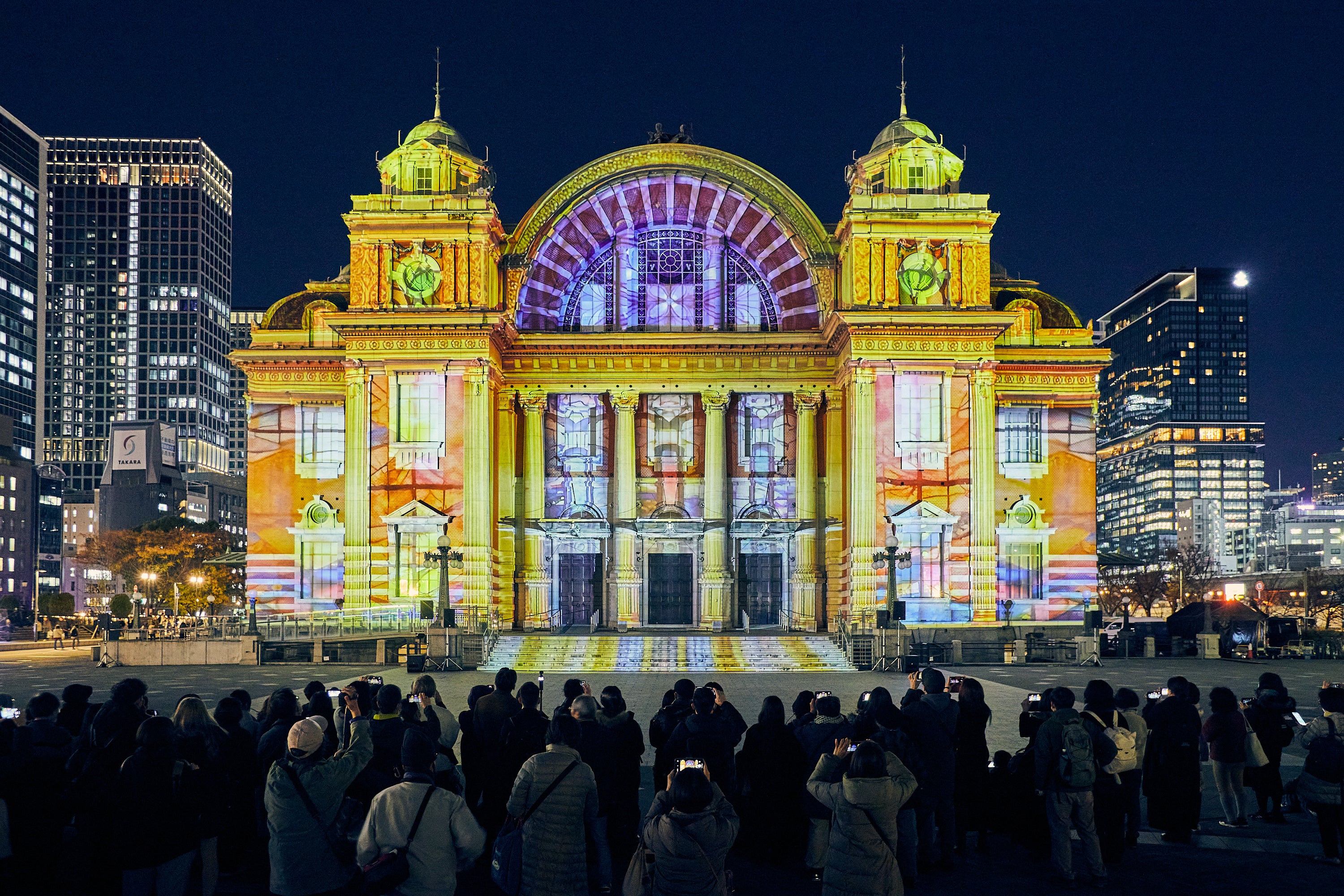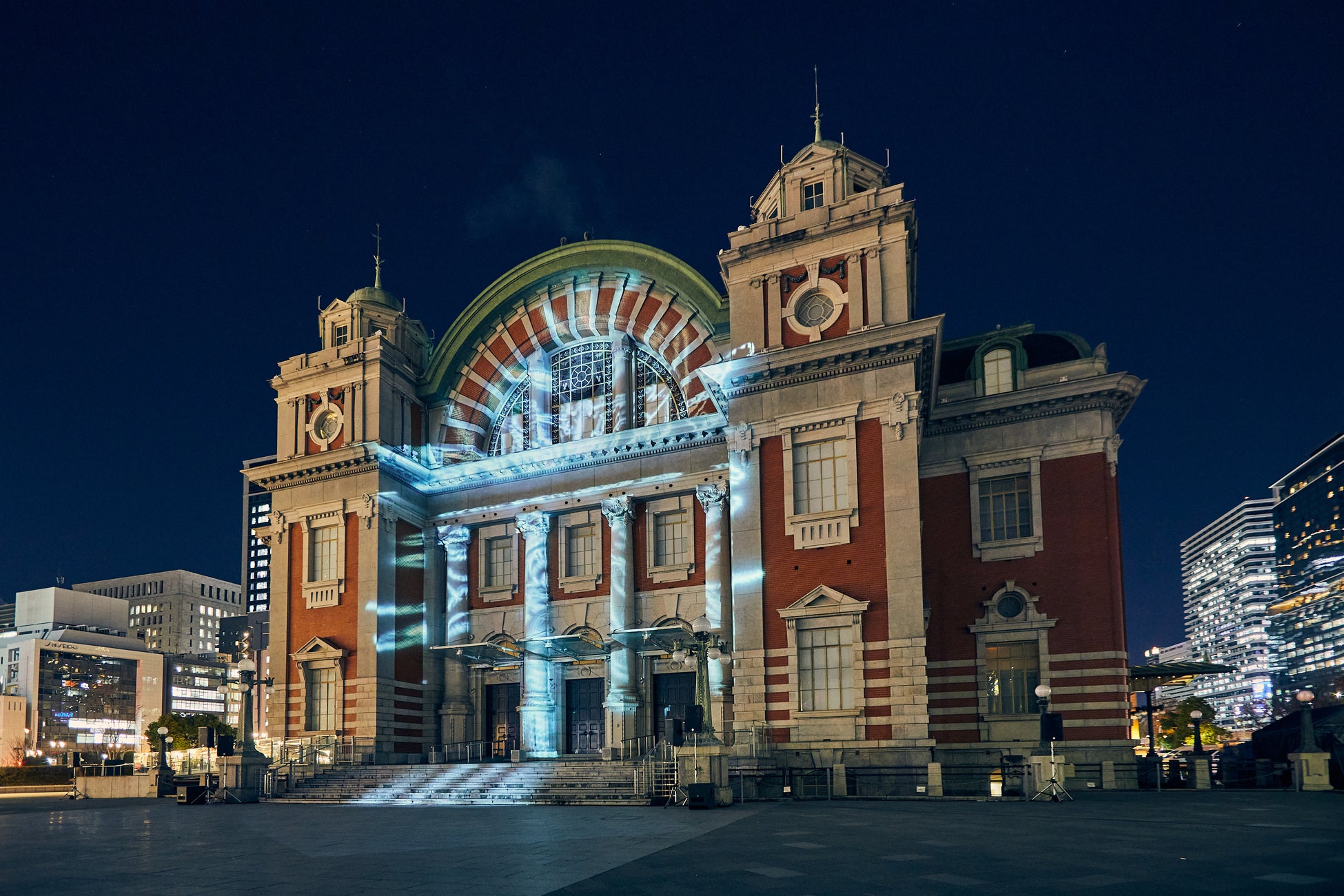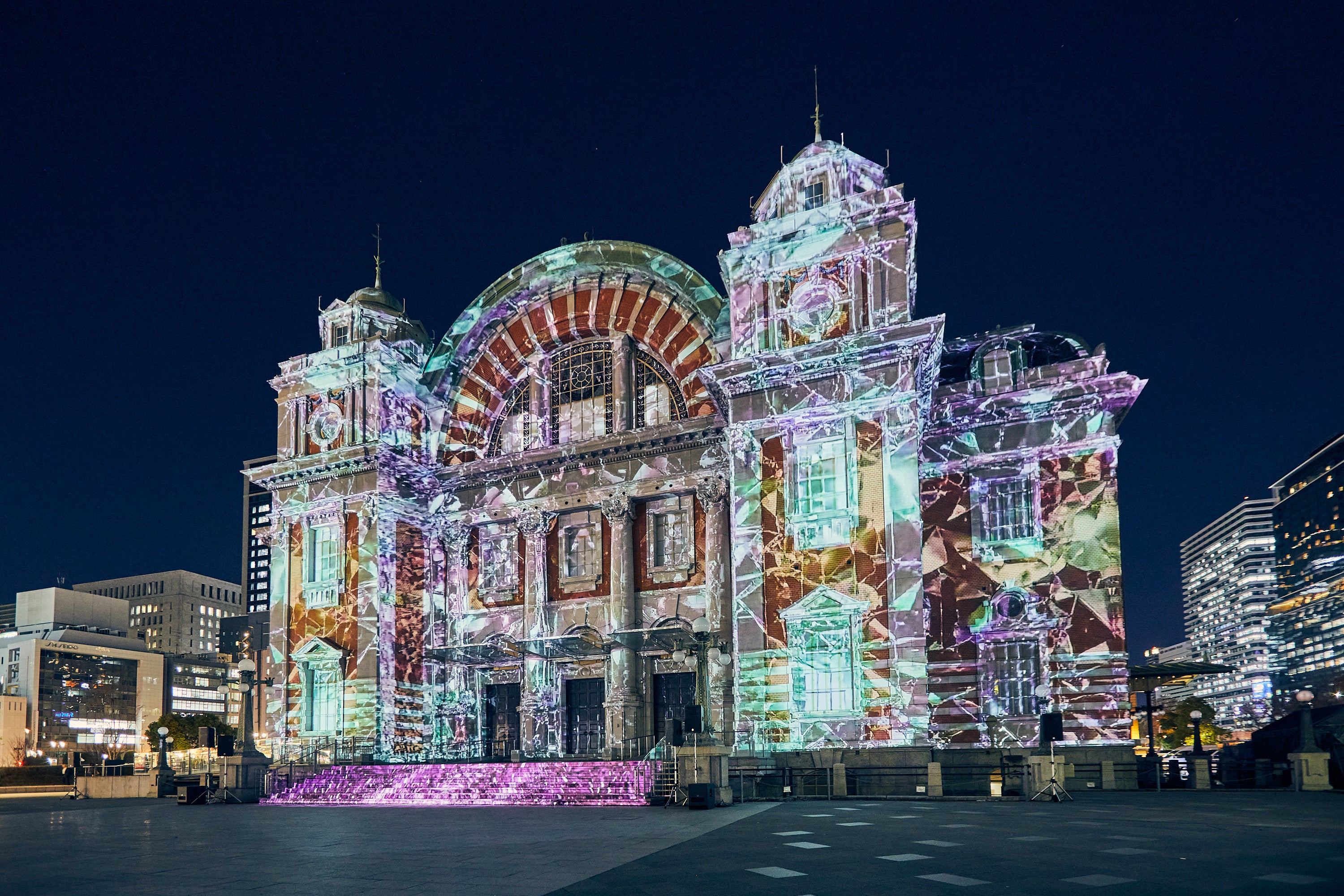 【内容】 「大阪・光の饗宴2025」のコアプログラム「OSAKA光のルネサンス2025」の中核コンテンツで、ネオルネッサンス様式建築の重要文化財・大阪市中央公会堂の壁面に、「光輝く大阪の夜」をテーマにステンドグラスの色彩と煌めき、水面のように揺れるクリスタルの光などのプロジェクションマッピング映像を投影しました。