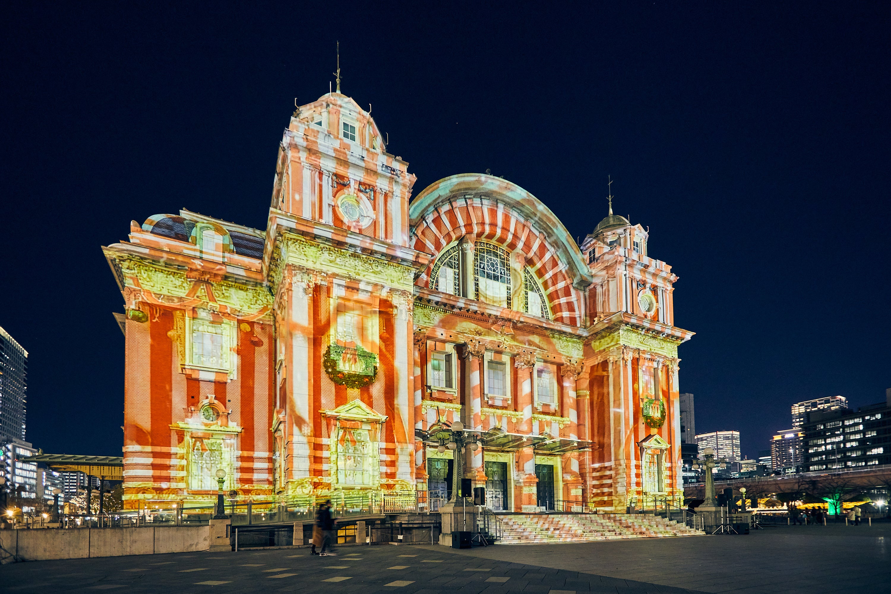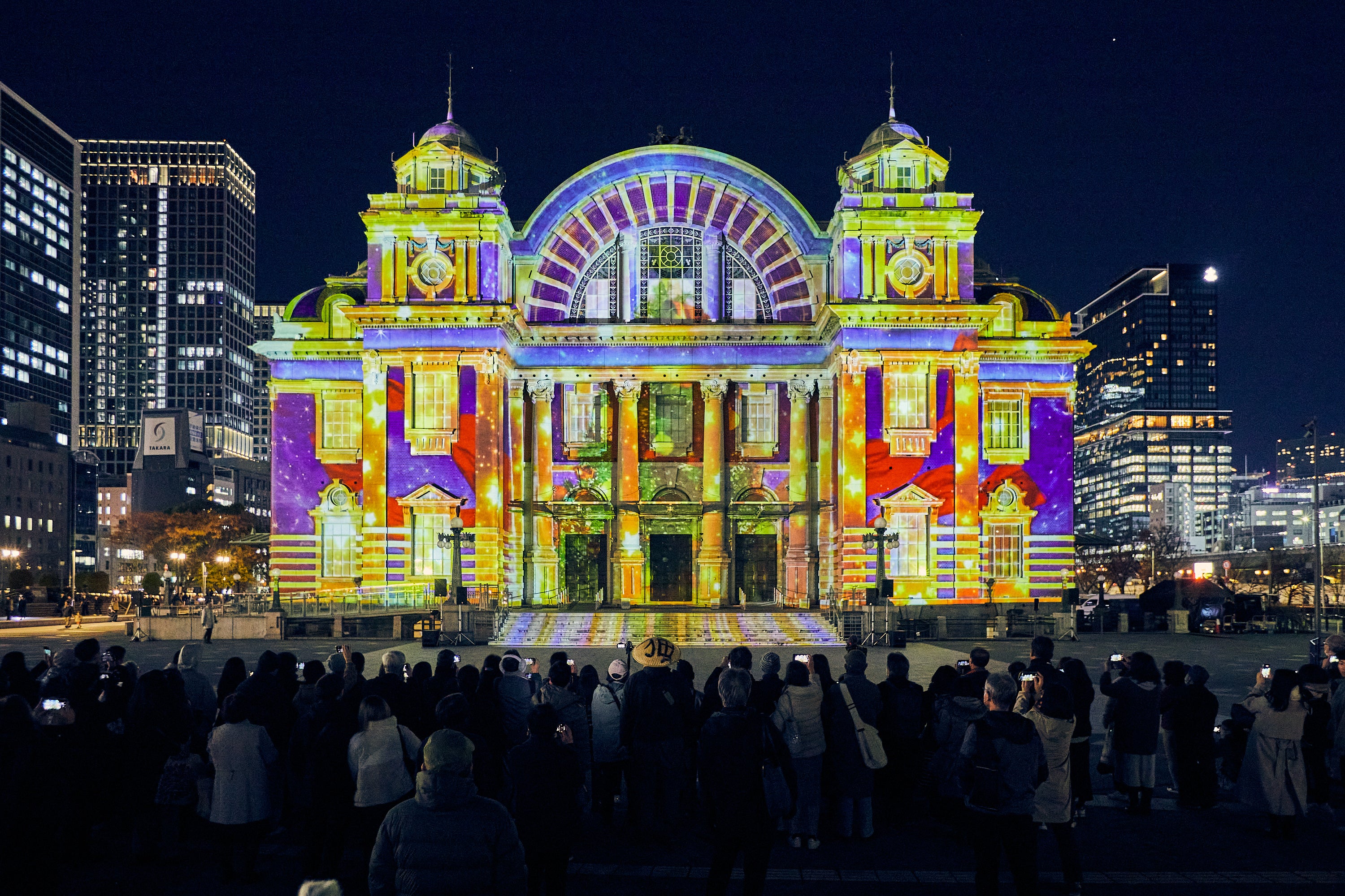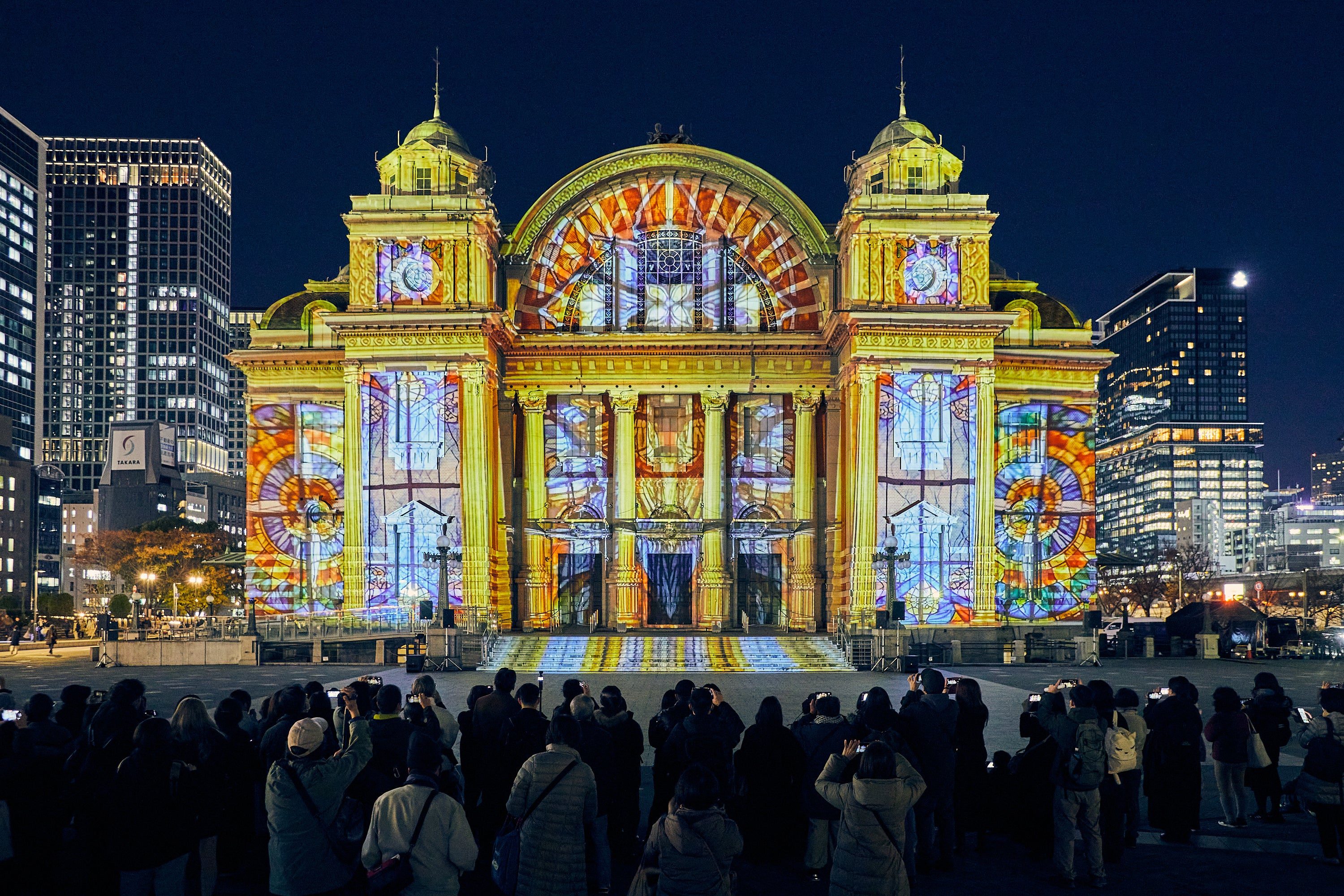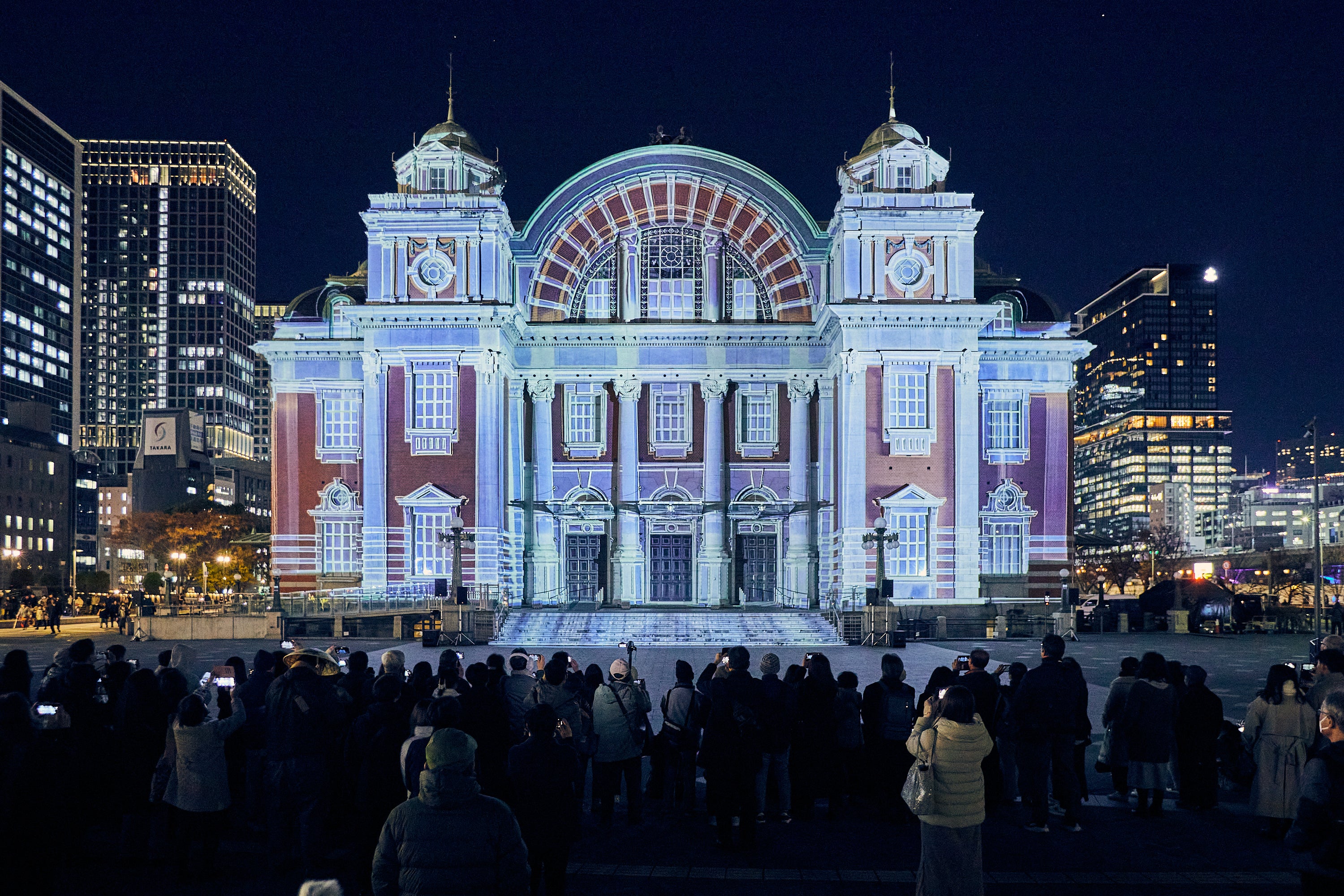 「大阪・光の饗宴2025」のコアプログラム「OSAKA光のルネサンス2025」の中核コンテンツで、ネオルネッサンス様式建築の重要文化財・大阪市中央公会堂の壁面に、「光輝く大阪の夜」をテーマにステンドグラスの色彩と煌めき、水面のように揺れるクリスタルの光などのプロジェクションマッピング映像を投影しました。