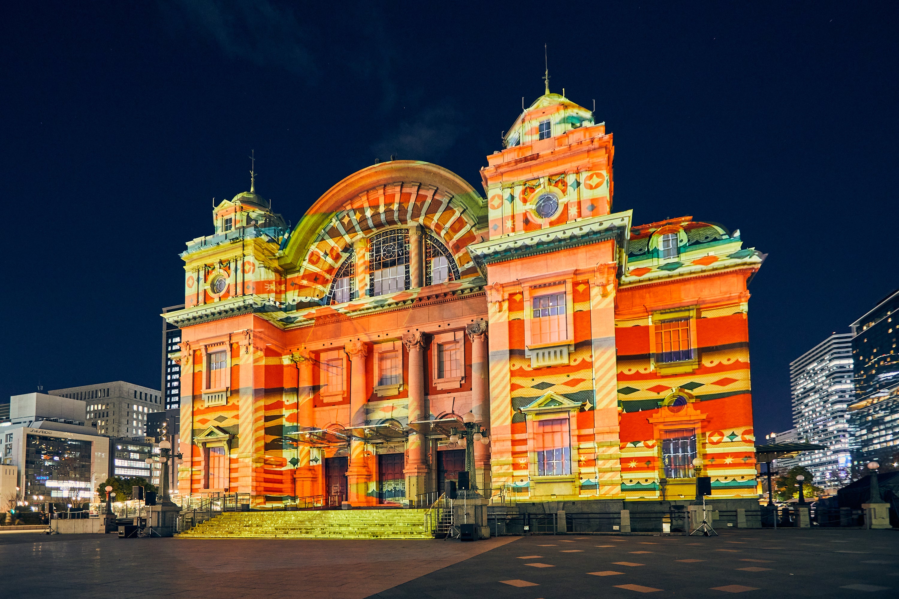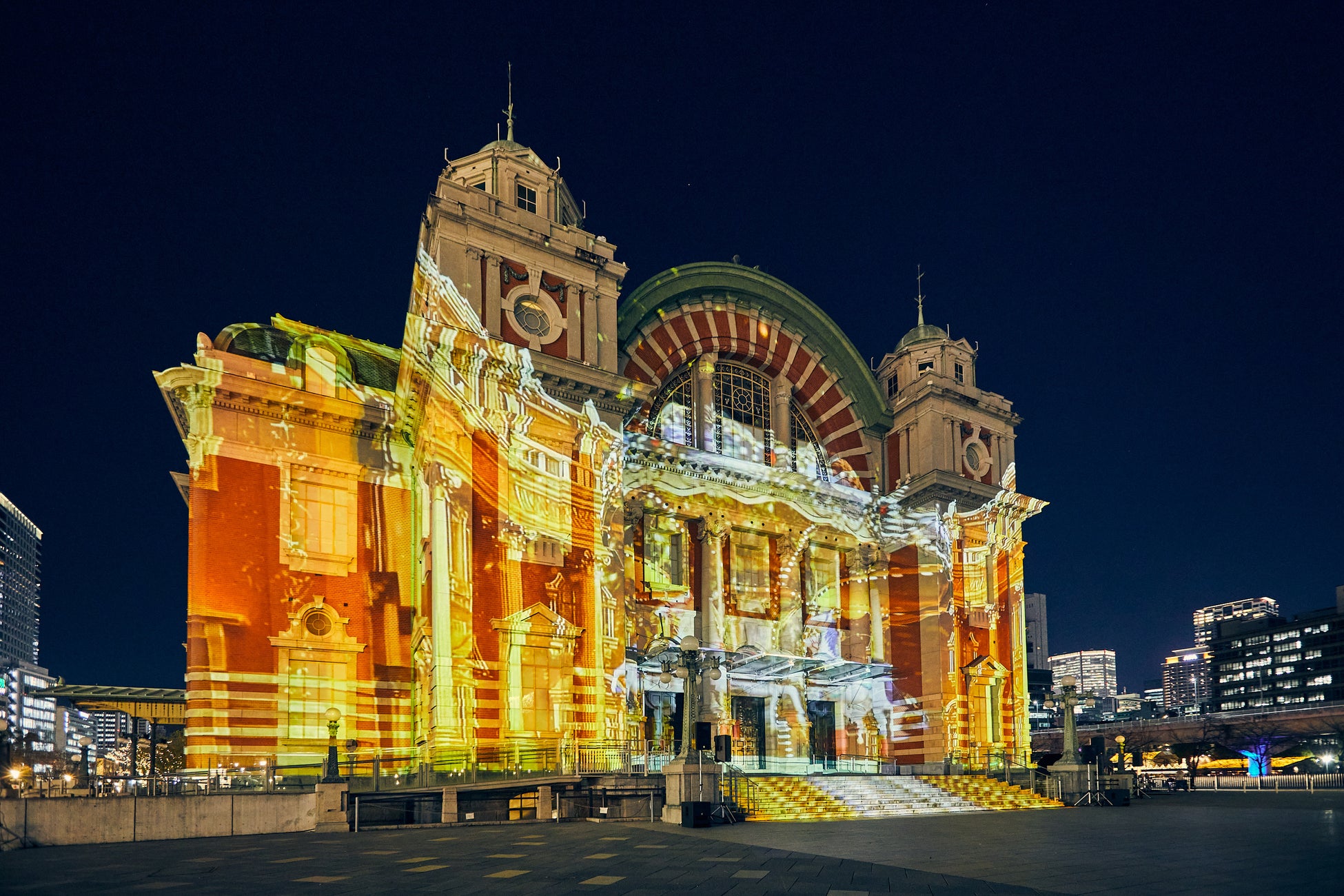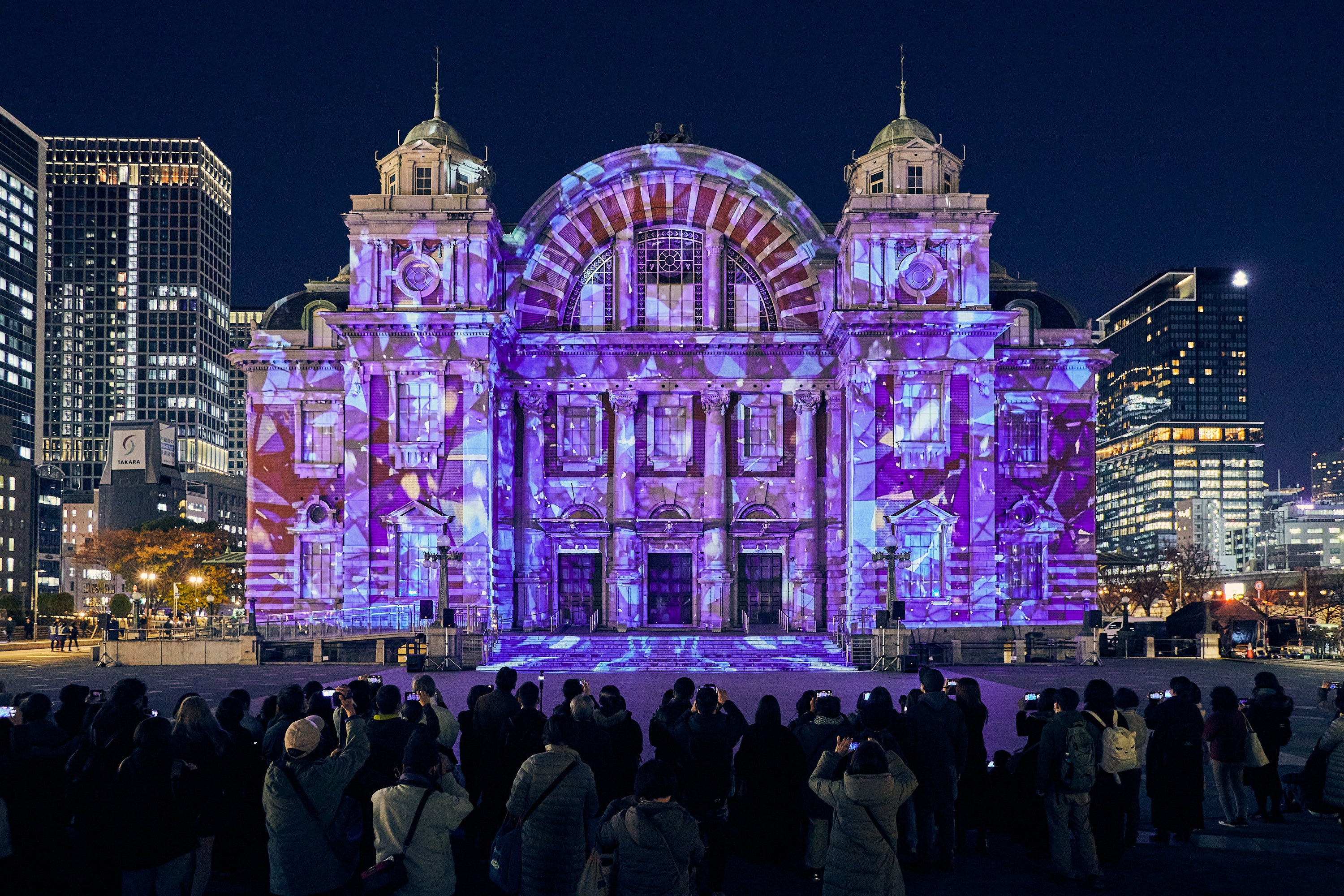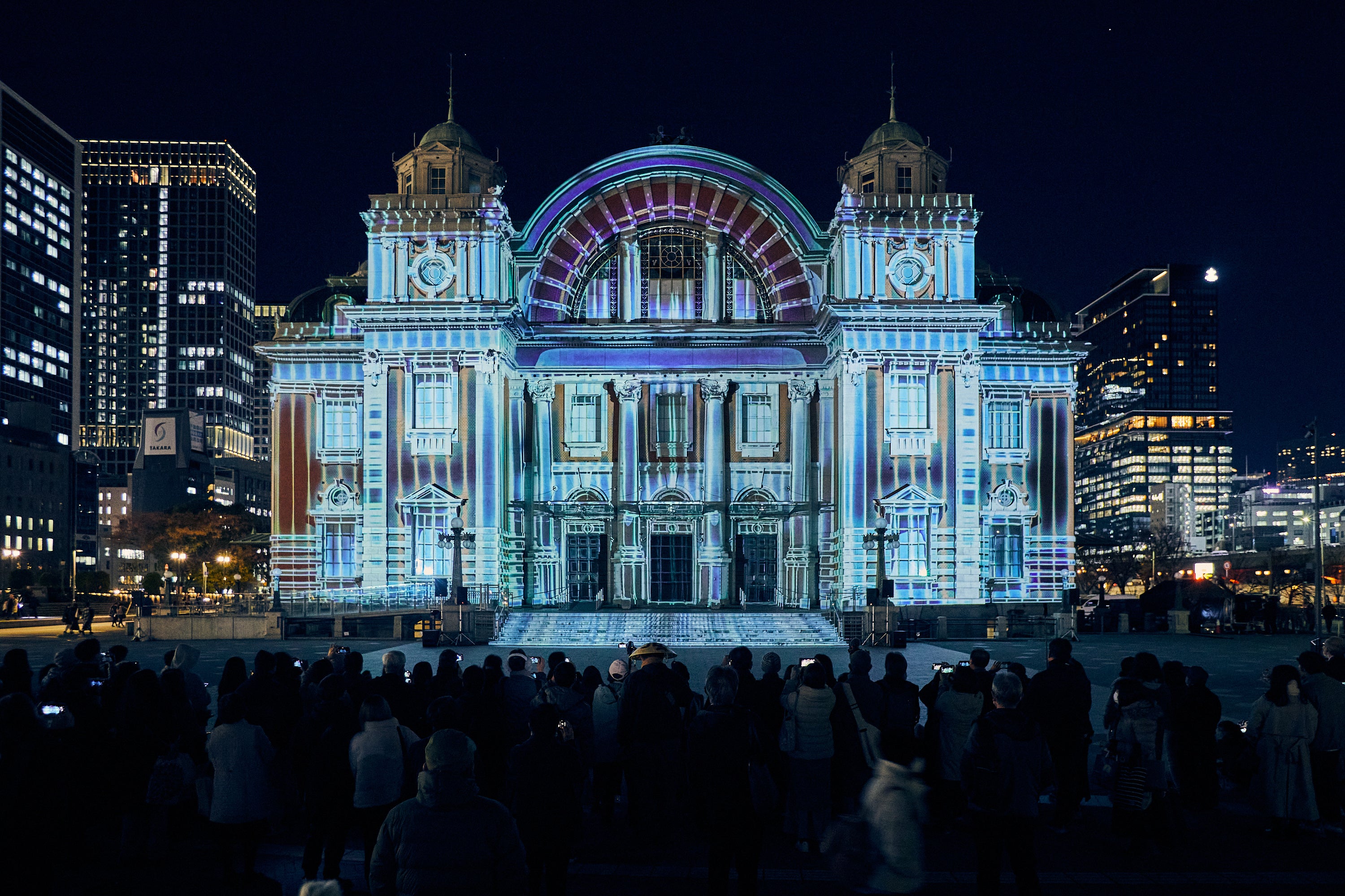 「大阪・光の饗宴2025」のコアプログラム「OSAKA光のルネサンス2025」の中核コンテンツで、ネオルネッサンス様式建築の重要文化財・大阪市中央公会堂の壁面に、「光輝く大阪の夜」をテーマにステンドグラスの色彩と煌めき、水面のように揺れるクリスタルの光などのプロジェクションマッピング映像を投影しました。