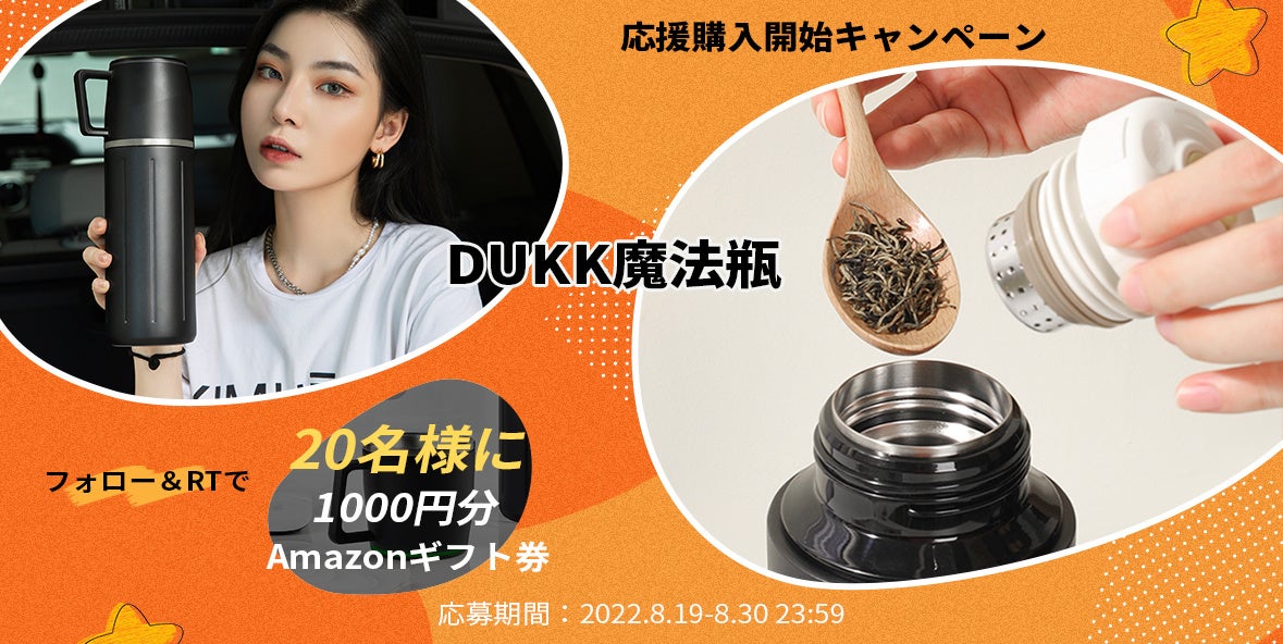 鑫三海株式会社(本社:大阪府堺市堺区、代表取締役:伴場 義通)は、Amazonギフト券1,000分がフォロー&RTで20名様に抽選で当たる、「DUKK魔法瓶 応援購入開始キャンペーン」を、AFUストアのTwitter公式アカウントで8月19日に開催しました。