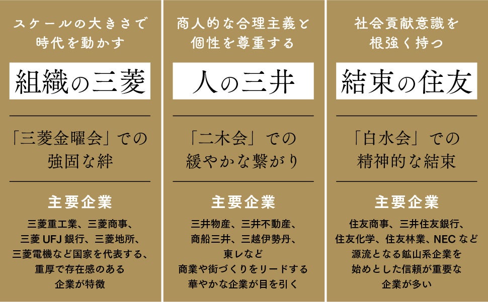 なぜ三菱は「組織」を重要視するのか、なぜ三井に「自由な雰囲気」があるのか、なぜ住友に「絆の強さ」を感じるのか……各グループの歴史がわかれば、そのキャラクターにも深い理解を示すことができます。
