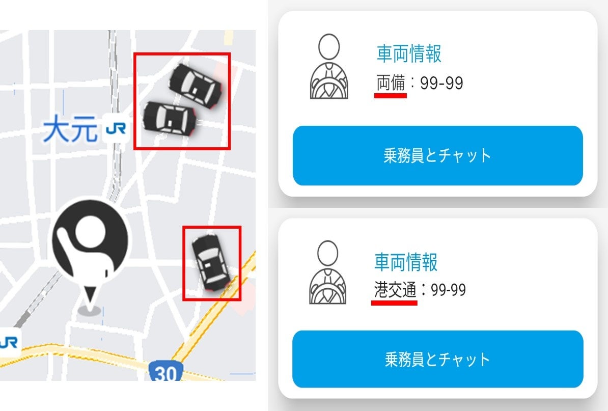 アプリ地図上に表示されるタクシーアイコンの色がタクシー会社に関わらずすべて黒色になりました。(アプリバージョン1.1.14以降対応)。