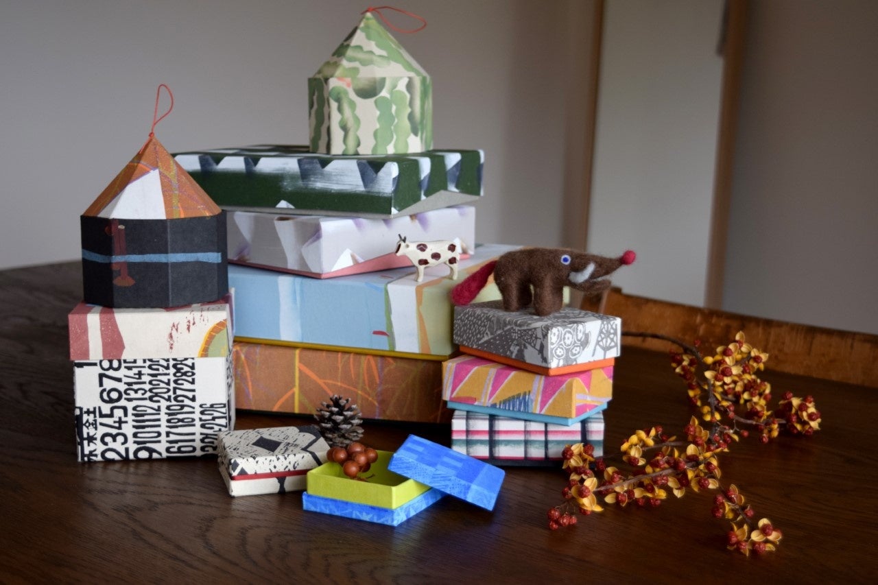クリスマスと言えばプレゼント。クリスマスツリーの下に置かれたたくさんの箱を見るだけで心が躍ります。今年はクリスマスシーズンにぴったりな、puntasによるギフトBOXをご用意しました。京都岡崎 蔦屋書店オリジナル柄もございます。サイズも形も豊富なBOXはすべて手作りで制作されており、小物入れとしてもお使いいただけます。特別なBOXに入ったギフトは受け取る側もうれしくなるはず。「puntas」は、“版画をもっと身近に”を合言葉に、京都精華大学版画専攻卒業の、折田治代・熊本汐里・本田このみの3人で活動している紙もの制作グループ。優しい色使いと愛らしいデザインの版画を箱や器などの作品へと仕立てています。