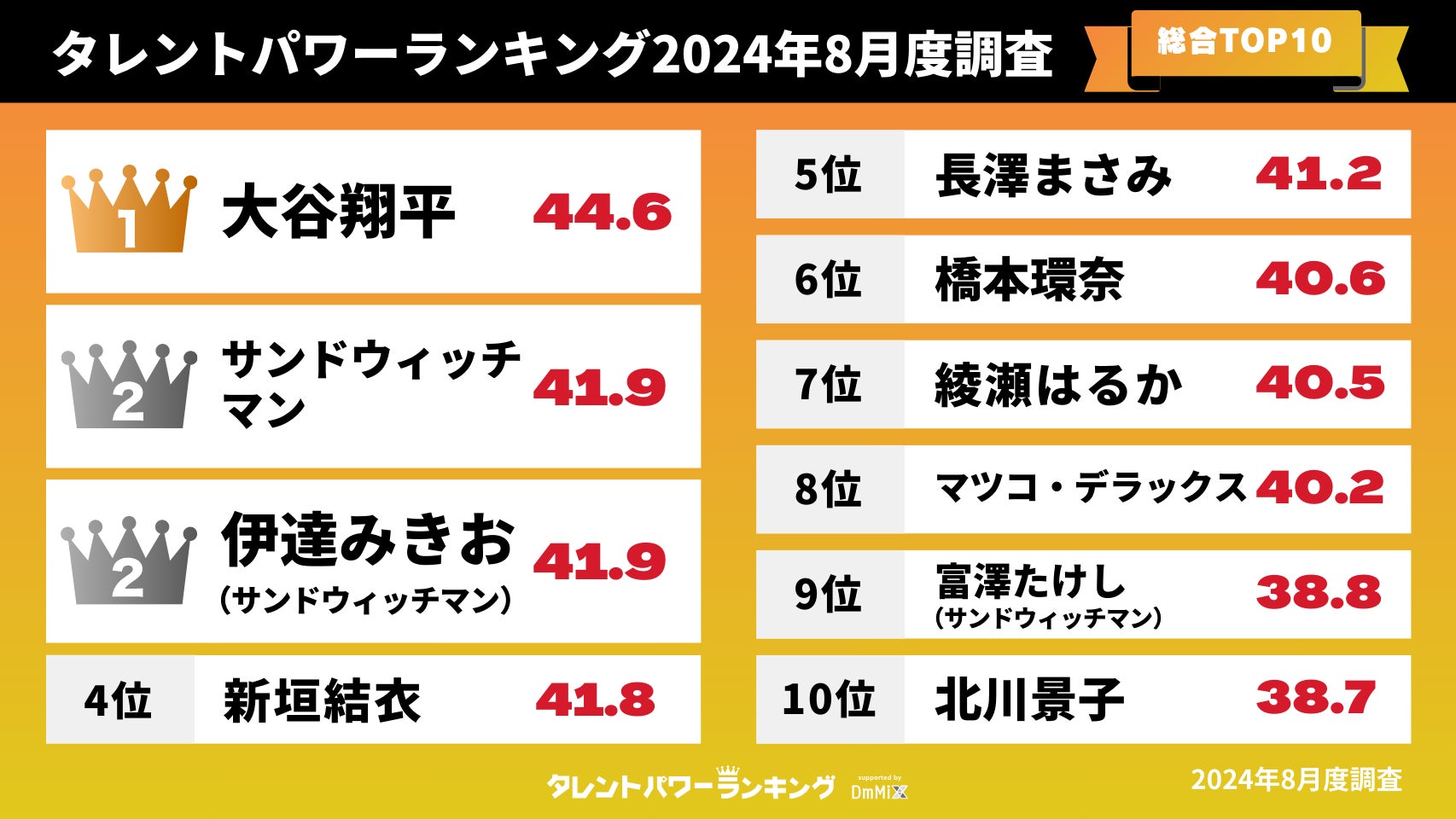 「タレントパワーランキング」2024年8月度調査(第3四半期)の総合トップ10を発表!