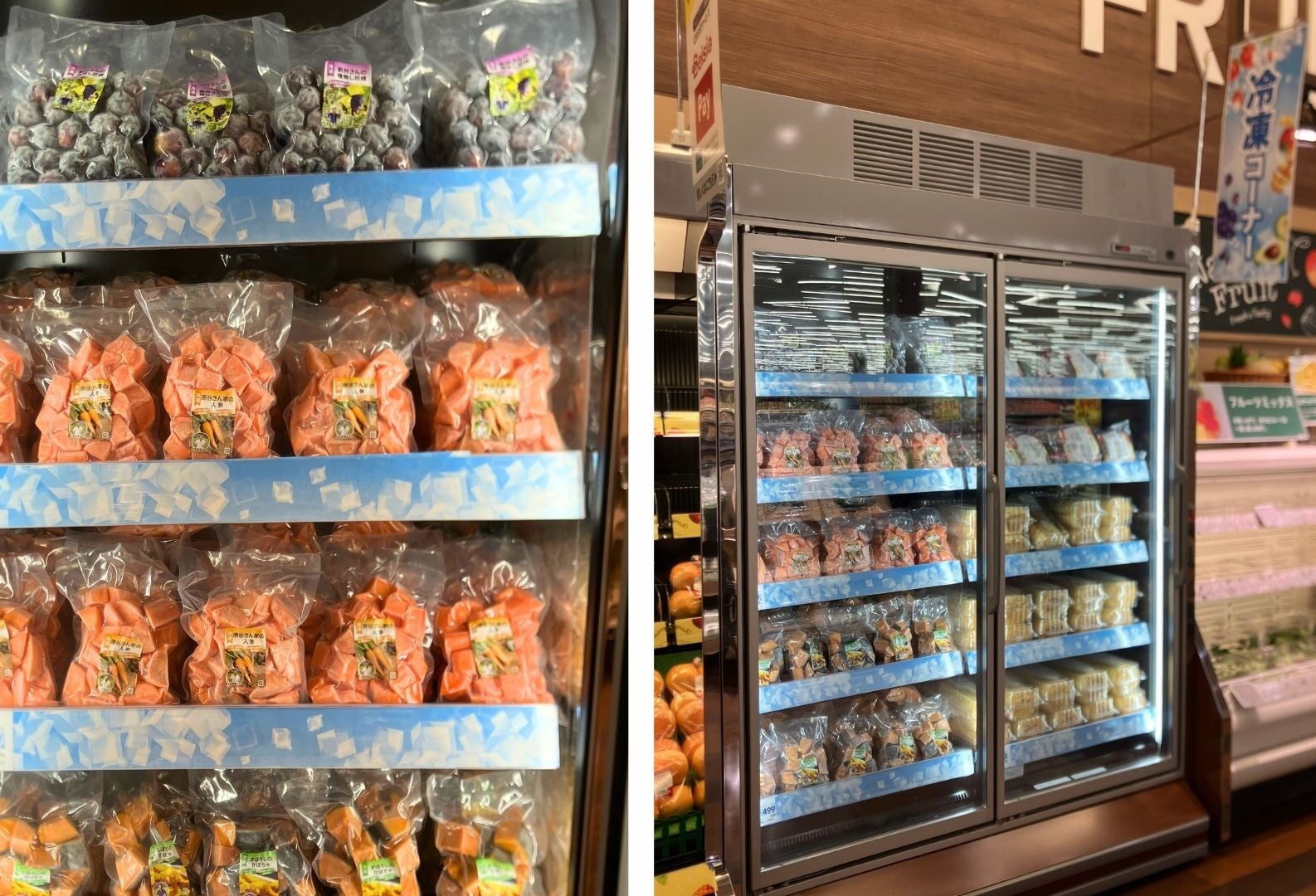 入口すぐの青果コーナーでは、新鮮な旬の果物や野菜がお買い得な価格で並びます。ほかにも新しく、店内手作りのカットフルーツ・フルーツパフェが並ぶデザートコーナーや、こだわりの国産の果物・野菜の冷凍コーナーなど、お客様においしさと楽しさをお届けする工夫を取り入れました。