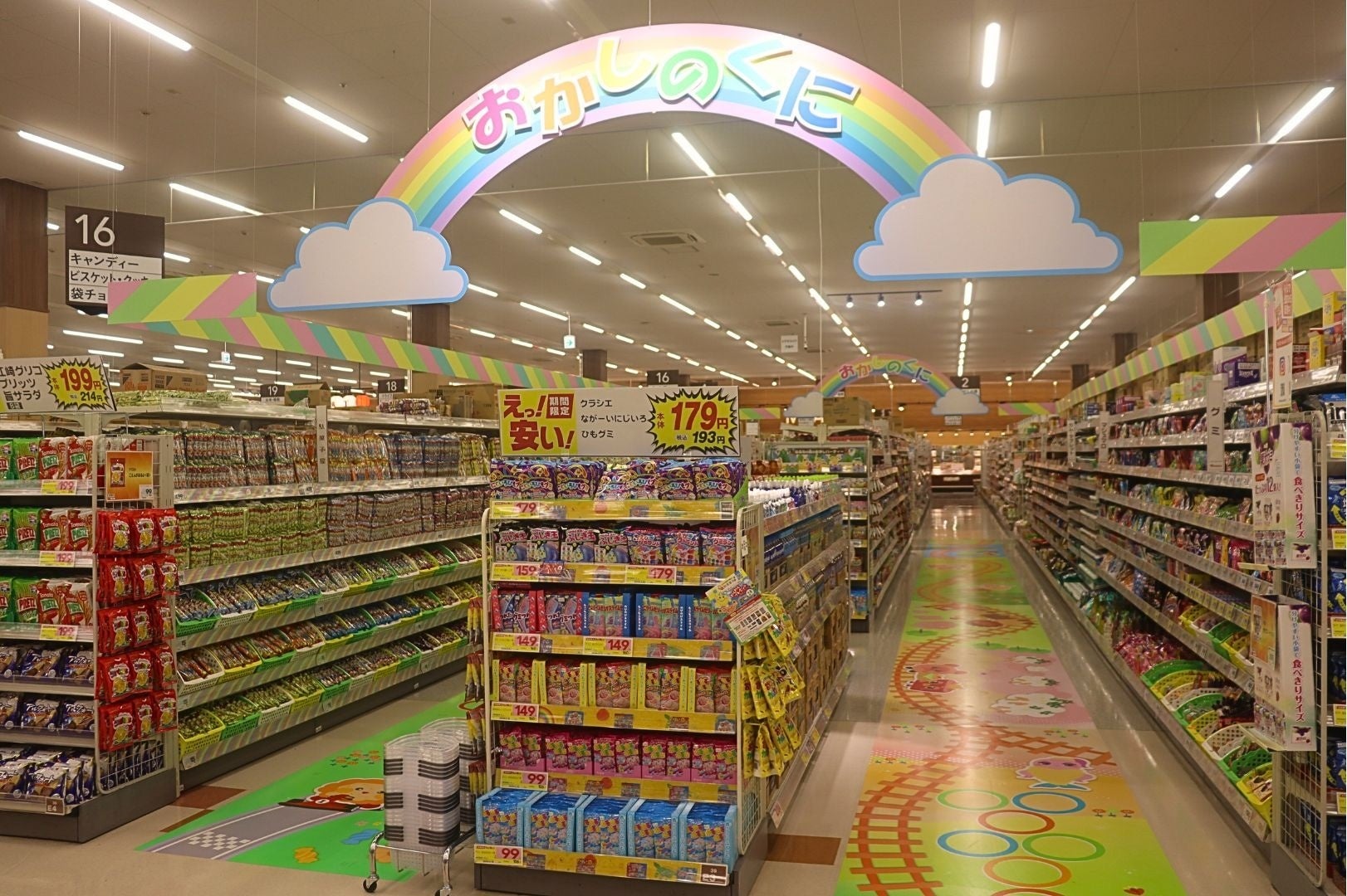 お菓子コーナーは「おかしのくに」として駄菓子やグミなどを集合展開し、選ぶ楽しさが広がる売場に生まれ変わりました。お子様も一緒にお買い物に行きたくなるような、ワクワク感あふれる空間です。飲料コーナーはまとめ買い需要に応えて、ケース販売の売場を拡大しました。
