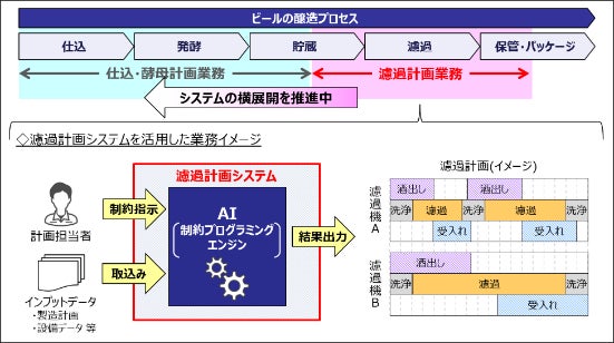ビール類の製造計画における「仕込・発酵計画業務」及び「濾過計画業務」をAIによって自動化したシステムです。「濾過計画自動化システム」では、今まで1回に最大6.5時間かかっていた計画策定作業を、当システムの導入により最短で55分まで短縮することが可能です。導入前に比べキリンビール全9工場計で年間3,000時間以上の時間創出を見込んでいます。