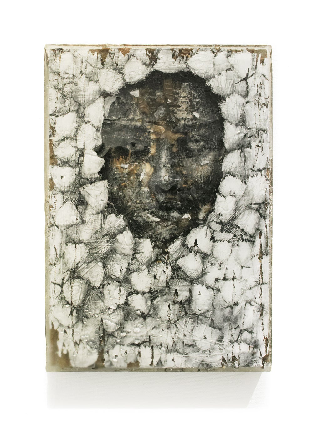 今回開催される個展「死と再生のイニシエーション」では、積層ダンボールに絵を完成させ、ナイフで絵を傷つけ、半立体に再構築、樹脂で硬化、という4工程で、誕生、死、再生、永遠を表現したシリーズ作品「RESIN 死と再生」を展示販売いたします。