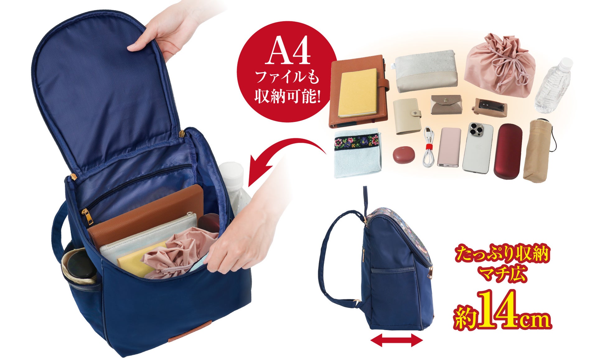 見た目よりたっぷり入るマチ幅約14㎝で、お出かけ時の必需品や小物もスッキリ収納♪