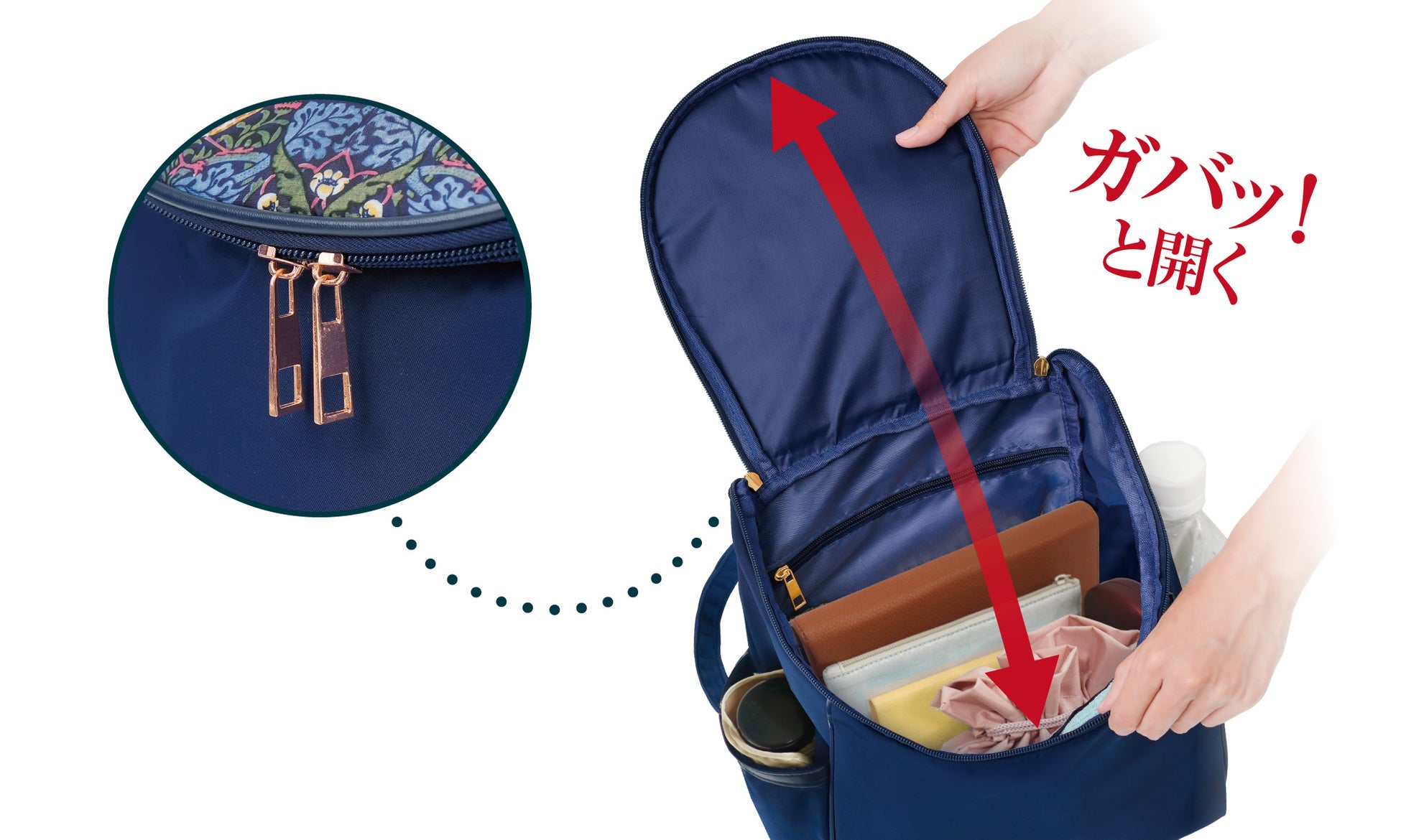 ダブルファスナー式で開閉しやすい!ガバッと大きく開いてバッグの中身が見やすくサッと取り出せます。