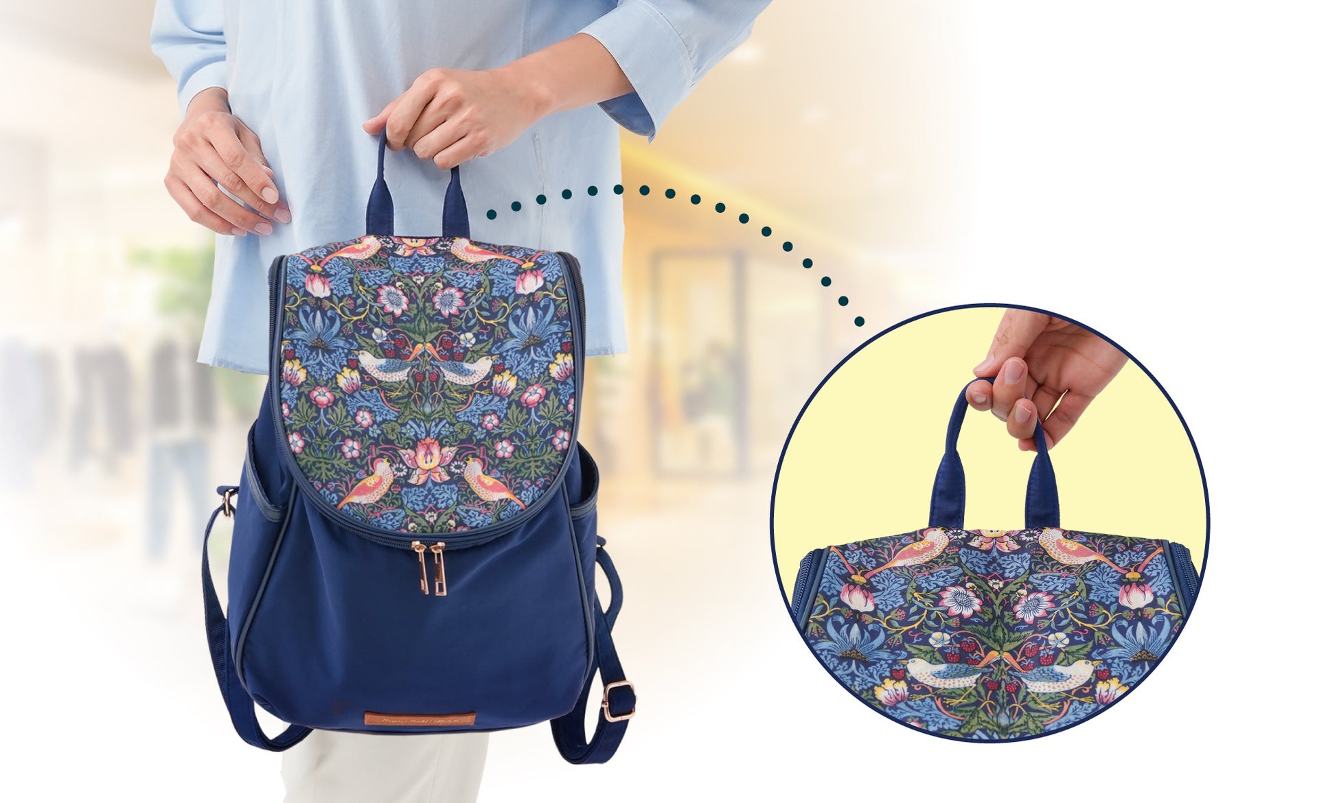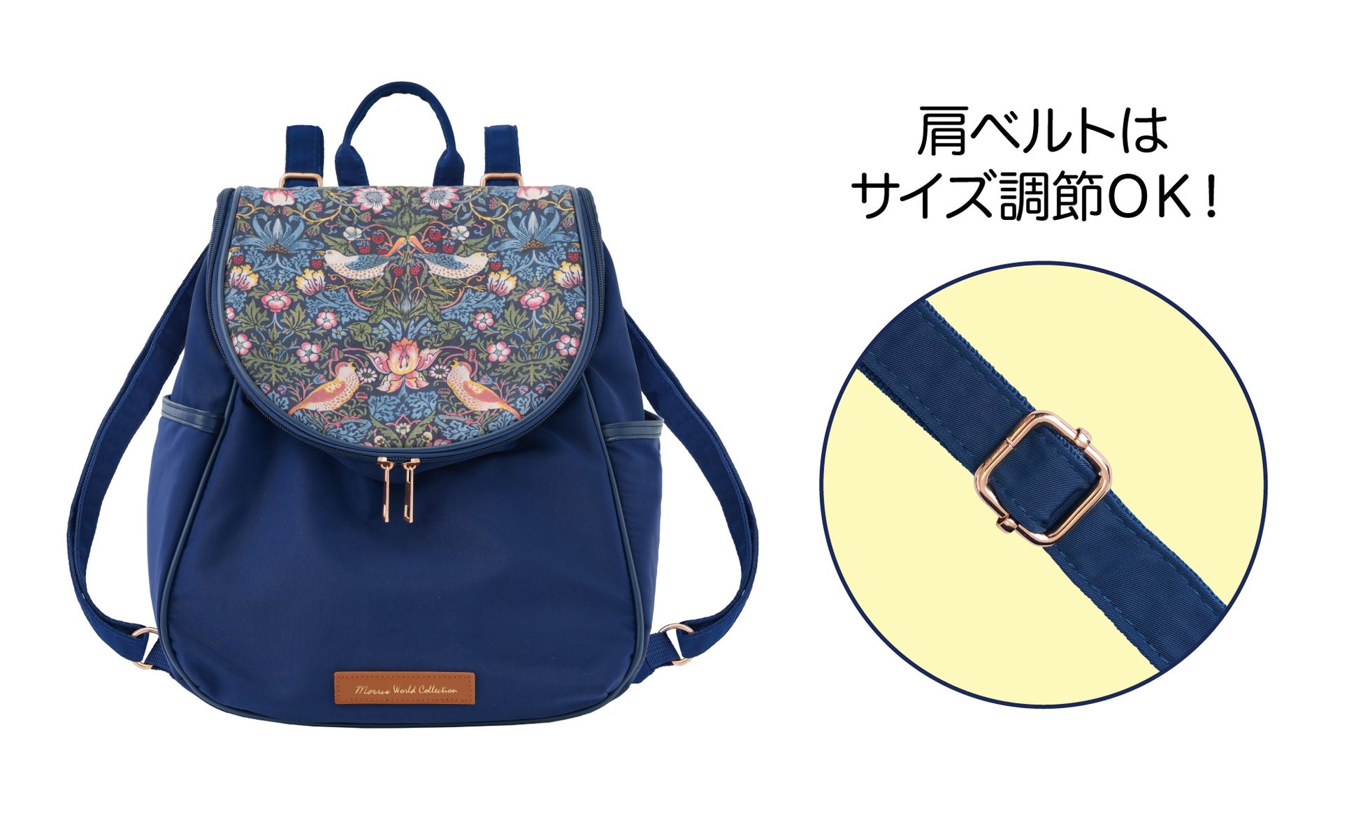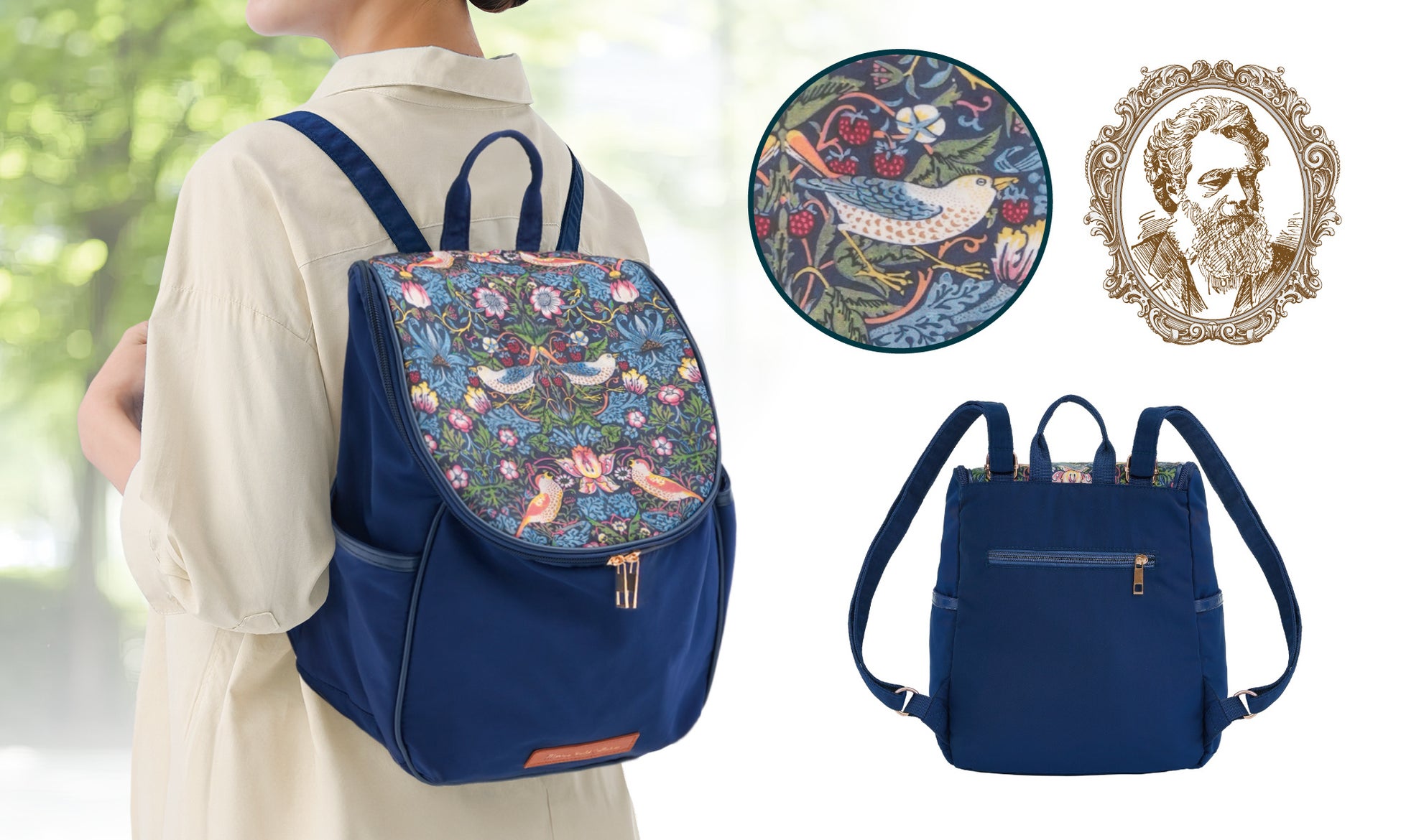ガバッと開いて出し入れ楽チン!コロン♪とかわいい「いちご泥棒」柄、収納上手なリュックサック