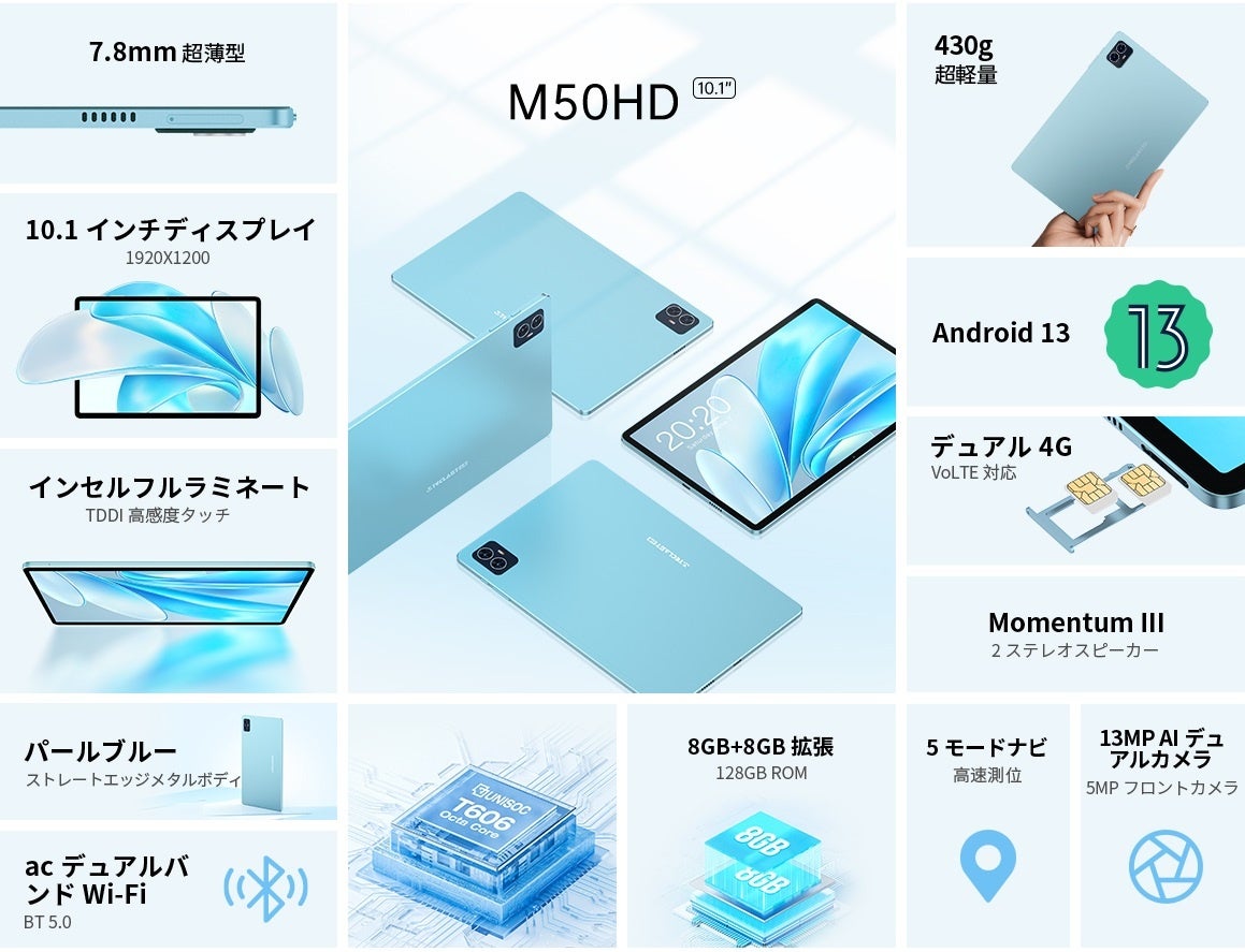 Teclast M50HDは10.1インチのフルラミネートフルHDスクリーンを搭載。消費電力と性能のバランスが取れたUnisocT606オクタコアプロセッサを搭載し、8GBのRAMと128GBのストレージを備えています。外観の美しさと内部のパワーのバランスが取れています。IPSディスプレイを搭載し、画面対ボディ比は最大83%、解像度は1920×1200のフルHDで、息をのむような視覚体験を提供します。洗練されたパールブルーのカラーパレットを採用し、わずか7.8mmの薄さと約435gの軽量なストレートエッジのメタルデザインによって引き立てられています。