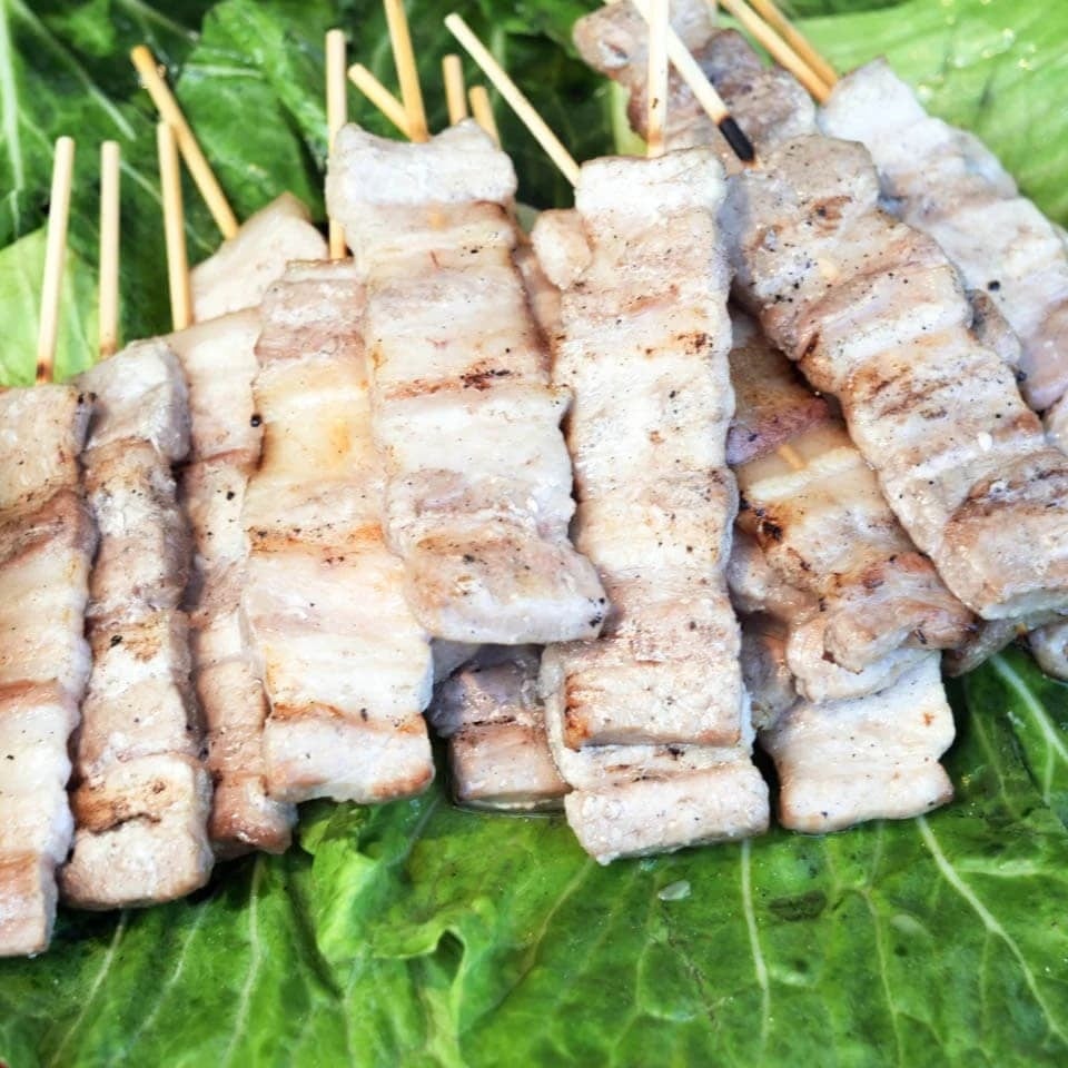 韓国の焼肉といえばサムギョプサル。豚バラの三枚肉を焼いてコチュジャンなどで味付けして食べる焼肉料理を食べやすく串にしました!