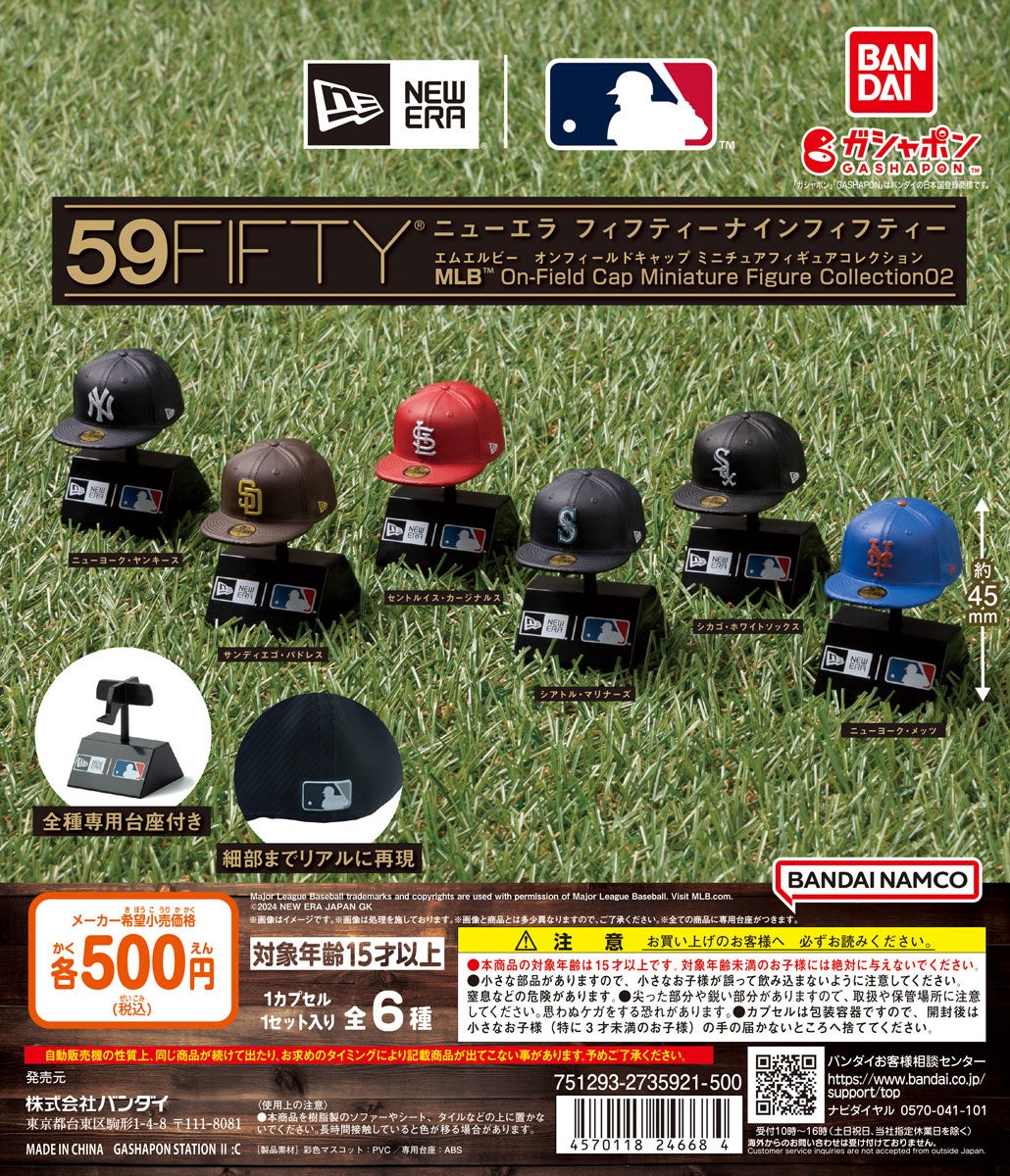 株式会社バンダイ ベンダー事業部(本社:東京都台東区)は、「NEW ERA®」の名作[59FIFTY®]をミニチュアサイズにしたガシャポン®の第4弾として、MLB™の人気球団のキャップをラインアップした、「NEW ERA® 59FIFTY® MLB™ On-Field Cap Miniature Figure Collection 02」(1回500円・税10%込、全6種)を2024年12月第2週から順次、全国のガシャポンバンダイオフィシャルショップ、玩具売場、量販店、家電店などに設置されたガシャポン⾃販機シリーズにて発売いたします。また、NEW ERA® STORE(※アウトレット店舗及びニューエラスタンド除く)でも発売いたします。