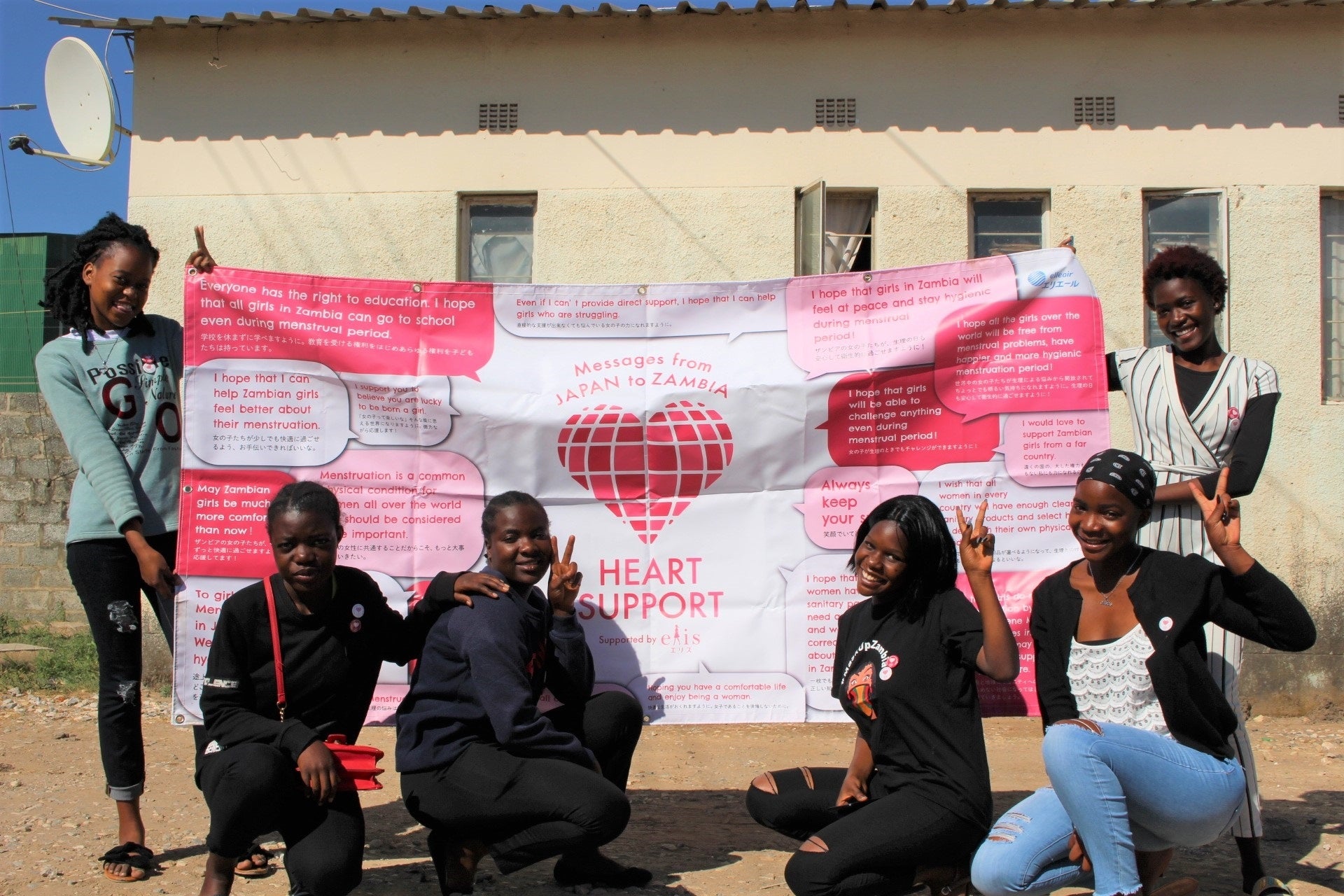 2018年、“チャレンジし続ける女の子を応援する”がコンセプトの生理用品『エリス コンパクトガード』の発売とともにスタートした「ハートサポート」プロジェクト。世界中の女の子たちの環境について考え、行動するきっかけにしてほしいとの想いから、10月11日の「国際ガールズ・デー」※に始動し、今年で4回目を迎えます。2021年度からは、SNSのメッセージが支援につながる参加型プロジェクトを通じ、ザンビア共和国・首都ルサカ市のスラム街にて生理用ナプキンを買うことができず、不衛生な代用品で感染症のリスクを抱える女の子たちをサポート。一過性の支援ではなく、生理用品をくり返し利用できるように布ナプキンの作製支援を行うコミュニティスペースを開設し、作製した布ナプキンの販売によって収入を得る機会を提供すると同時に、健康・衛生・性に関する知識の普及を行うことで、女の子たちを取り巻く環境や意識の改善に取り組んできました。