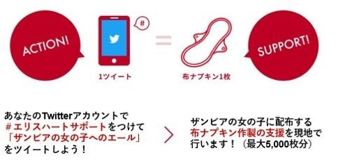 【概要】Twitterでハッシュタグ「#エリスハートサポート」がついたザンビアの女の子へのエール投稿を集計し、同数の布ナプキンの作製支援を行います。(参加受付は5,000件を上限とさせていただきます)