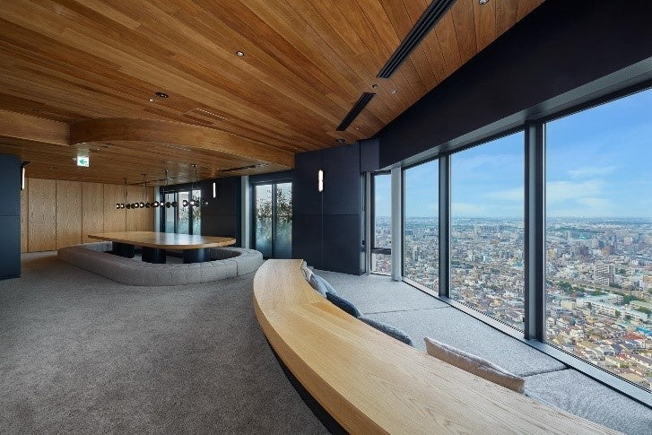 37階のスカイラウンジからは、超高層タワーならではの贅沢な眺望をお楽しみいただけます。掘りごたつ風のテーブルとラウンド型ビューシートを設置することで、リビングと同じように素足でくつろげる空間となっています。また、さまざまなシーンで活用してもらうため、調理家電の充実したキッチンや貸し切りサービスのほか、基壇部商業施設との連携や出張シェフ・ケータリングサービスとの提携も予定しております。