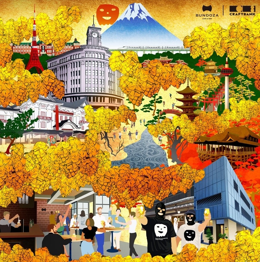 BUNDOZAの店名は、江戸時代の銀座に、銀貨幣の鋳造のために、計量用の秤に用いる錘の制作をする分銅座(BUNDOZA)という場所があったことにちなんでつけられました。かつて分銅の技術が京都から東京に伝わったように、「CRAFT BANK」のビールで京都と東京がつながることをテーマにイラストは描かれました。そして、「CRAFT BANK」は京都府福知山の銀行跡地でビールを作り始めたことから、銀行強盗のアイコンも。かつて銀貨幣を作っていた銀座エリアで銀行強盗マークのビールを飲むのも、粋な体験です。