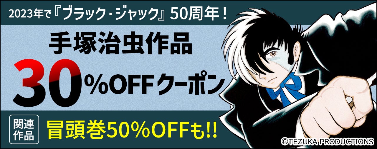 来年2023年で、連載50周年を迎える手塚治虫の不朽の名作『ブラック・ジャック』。「auブックパス」では、その50周年を記念し、手塚プロダクション&秋田書店の合同フェアを開催いたします。期間限定で『ブラック・ジャック』関連作品の冒頭巻が半額になるほか、「auブックパス」限定で同フェア対象のシリーズと手塚治虫作品に使える30%OFFクーポンも配布。『ブラック・ジャック』関連作品や、『火の鳥』『ブッダ』などの名作も今だけお得に! まだ手塚治虫作品に触れたことがない方はもちろん、昔読んだ方もぜひこの機会に読み直してみてはいかがでしょうか。