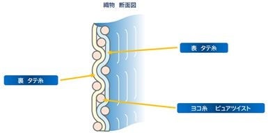 生地の織り方は、二重織を採用しています。表面と裏面のタテ糸でヨコ糸『ピュアツイスト』を包み込むような二重織構造にし、タテ糸による締めつけを減らすことで、『ピュアツイスト』のストレッチ性をより発揮しやすくしています。