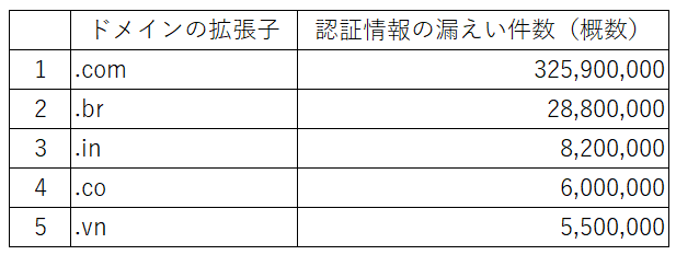 図2:ドメイン別の認証情報漏えい件数トップ5(2023年、対象はラテン文字の汎用トップレベルドメイン、データはKaspersky Digital Footprint Intelligenceより)