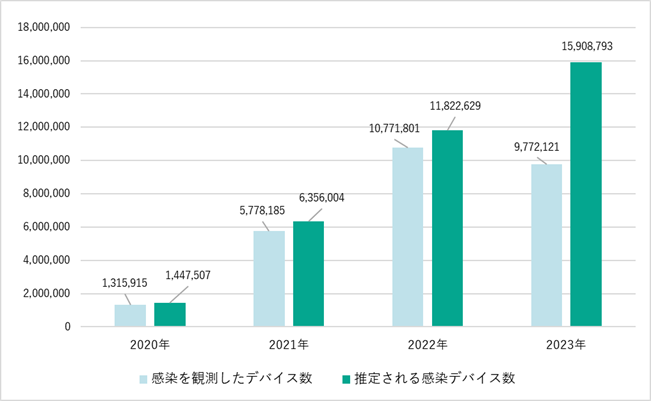 2022年以前は、窃取されたログイン情報はすでにほとんどダークネット上に流出しているため、観測した感染件数と予測する感染件数との差は小さくなっています。