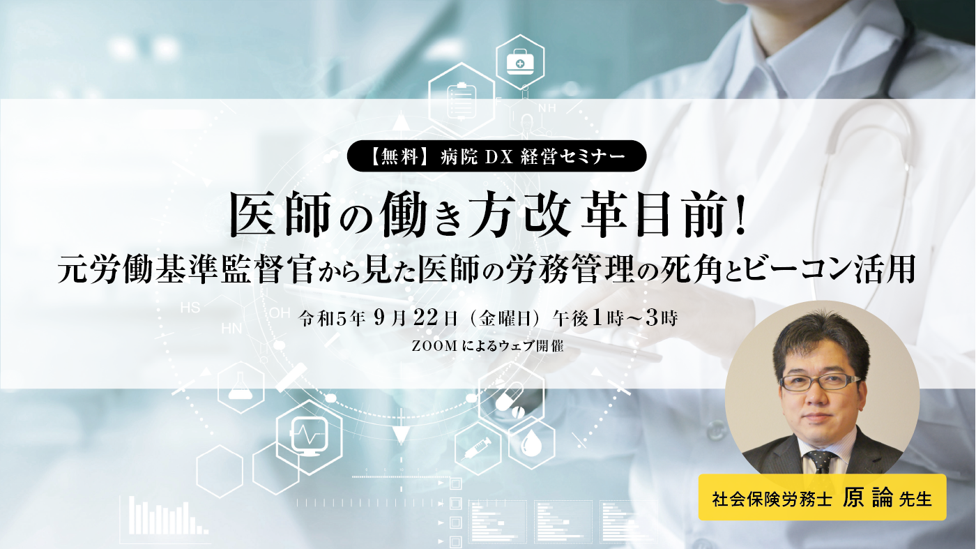 2024年4月の労働時間に関する働き方改革に備え、医療機関におかれましては「何に備えれば良いのか」、「今の準備で十分なのか」、「労働基準監督官は何を見ているのか」等、懸念点が多いと思います。このセミナーでは、元労働基準監督署監督官で社会保険労務士の原先生をお迎えし、2024年度法改正による医師の労務管理の変更点、見落としやすい点、労働基準監督官が何を見ているのか等について豊富な経験と実績に基づいてお話いただきます。また、医師の勤怠管理にも有効な近距離無線通信機器、ビーコンの活用法等も解説いたします。
