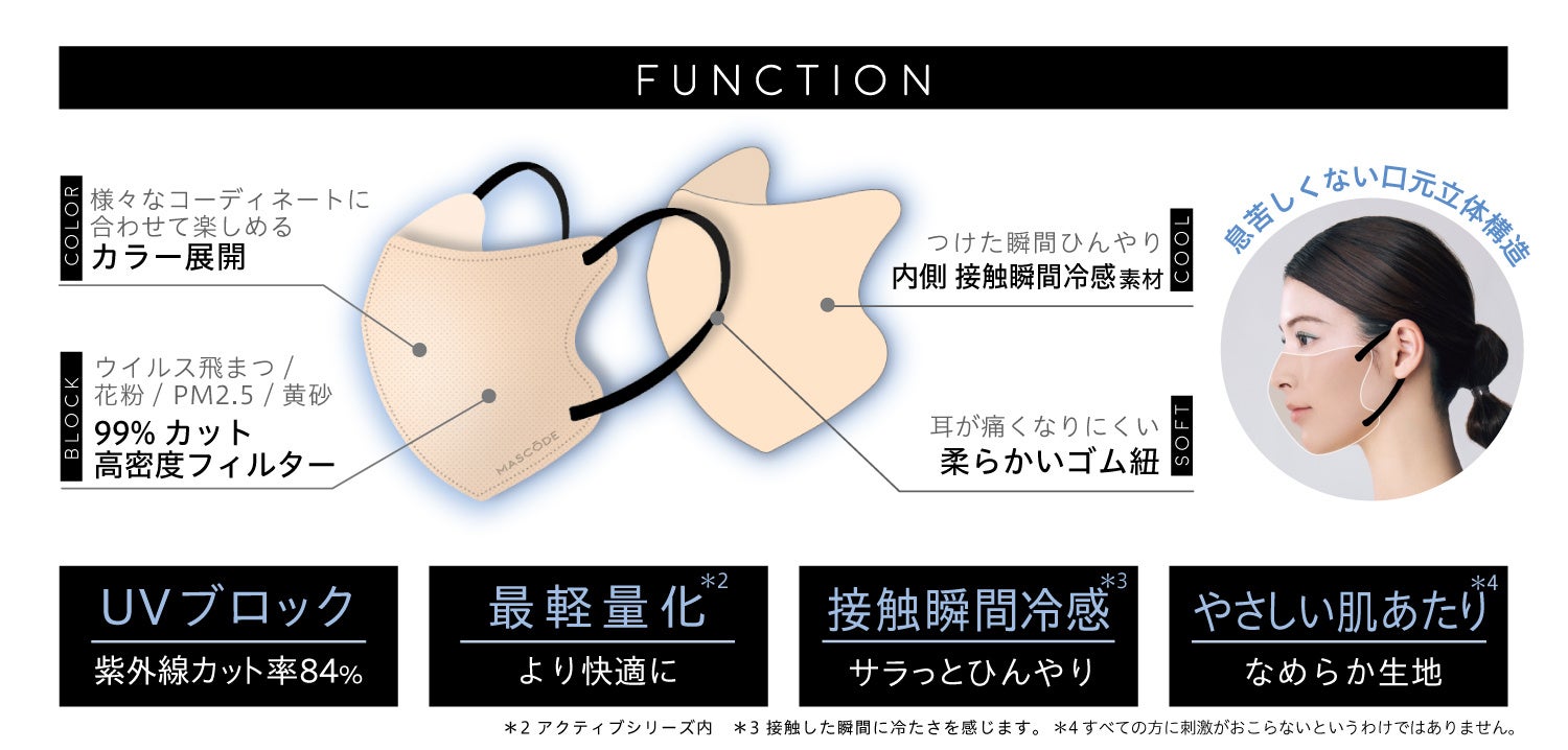 「MASCODE(マスコード)」は、ファッション性と機能性を両立させ、「マスクにドレスコードを」というコンセプトでTPOや服装、その日の気分に合わせてマスクを選び、組み合わせる新しい楽しみを提供してまいりました。そんな新たなマスクのスタイルを提案するブランドとして、「MASCODE Active Duo(アクティブ デュオ)シリーズ」はUVカット、接触瞬間冷感機能*1と合わせて、2シート構造になってより軽量化*2を実現しました。どんな時も心躍るマスクであなただけのファッションをぜひお楽しみください。