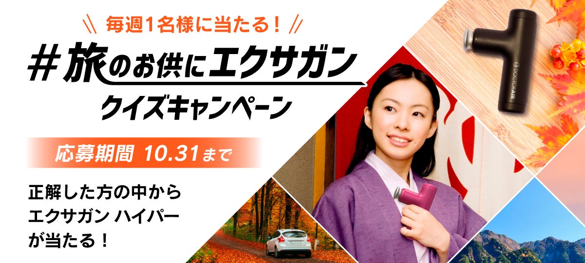 涼しくなり始め、全国各地への観光や、登山・キャンプなどのアウトドア活動を予定している方も多いのではないでしょうか。そこで『ドクターエア』では、旅のお供にぴったりな“持ち歩けるボディケア”で話題の【エクサガン ハイパー】をプレゼントするクイズキャンペーンを開催します!今回のキャンペーンでは、クイズに回答いただき正解した方の中から抽選で毎週1名様に【エクサガン ハイパー】をプレゼント!またWチャンスとして、フォロー&RTでお出かけにぴったりな【オリジナルトートバッグ】をプレゼントいたします。