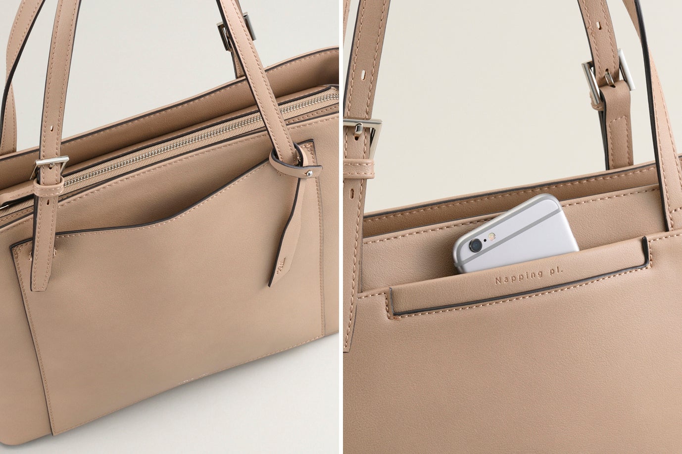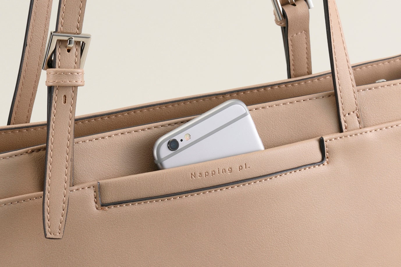 洋服のポケット感覚でスマートフォンやパスケースを出し入れできる「フロントポケット」や「背面ポケット」を配置しました。