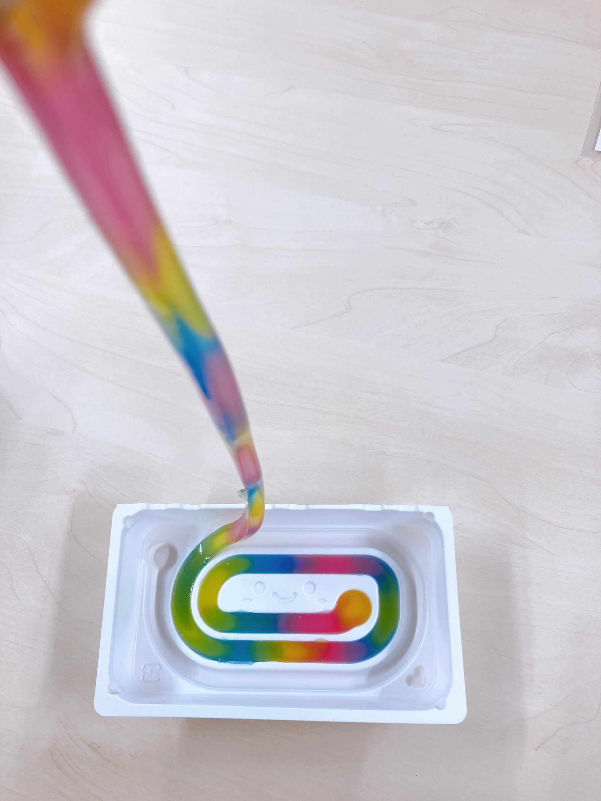 トレーにグミ液を注ぐと、3色が混ざり合って世界に一つだけのオリジナル虹色グミが作れます。色の広がり方は毎回違うので、何度でも新しい発見があります。また、出来上がったグミは横からみると流し込んだいろのもとの広がりやグラデーションがとてもきれいなので、見どころポイントです。