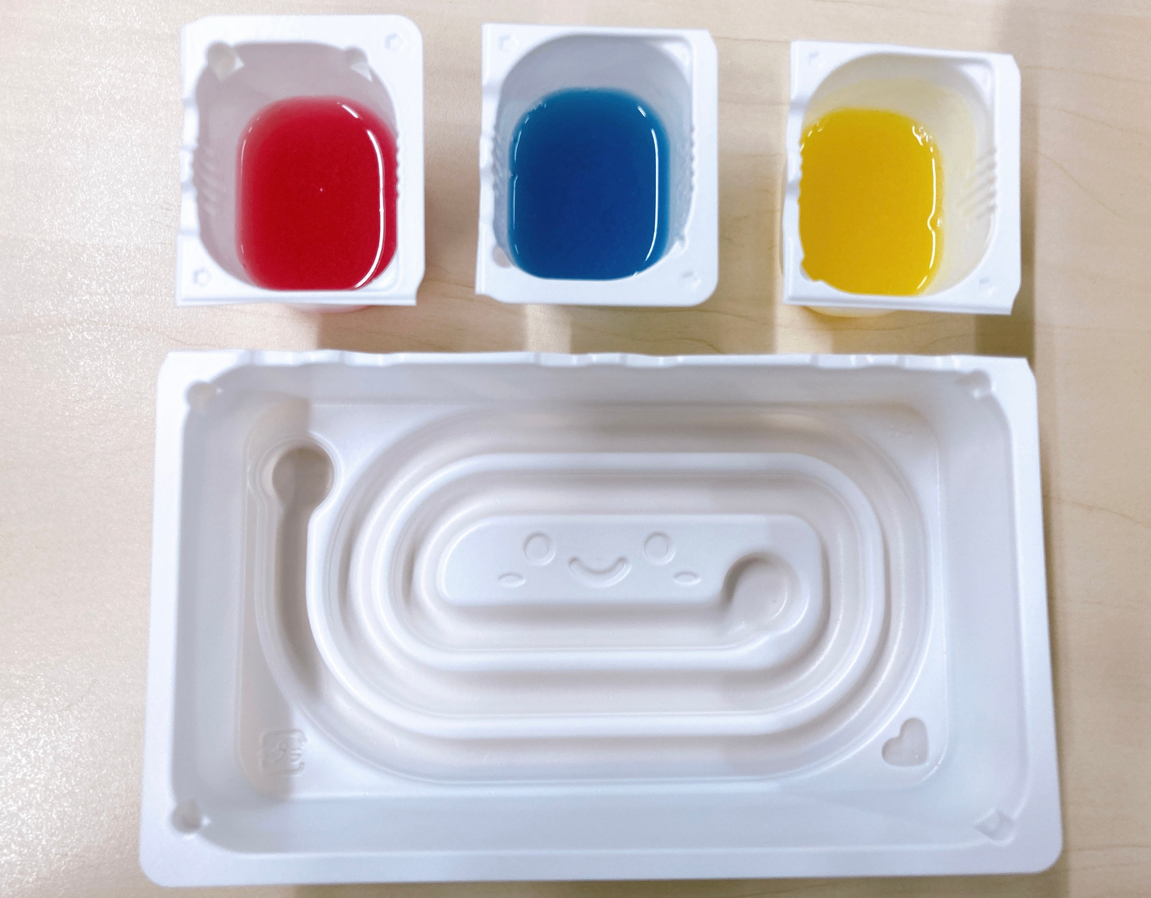 また、トレーの中央には、ニコッとした笑顔のモチーフを配置しています。包装を開けた瞬間から、ワクワクし、作ることが楽しみになるようデザインいたしました。また、ぐるぐるしている形状のため、色のグミ液を流し込んだ時に自然と液体がトレーに沿って動くのも面白いポイントです。