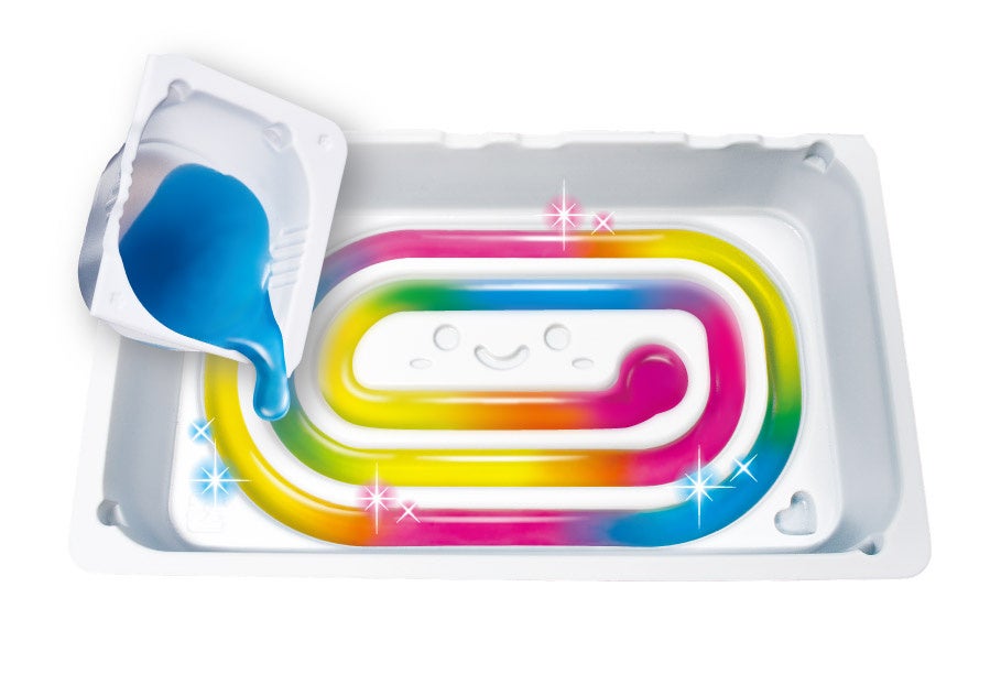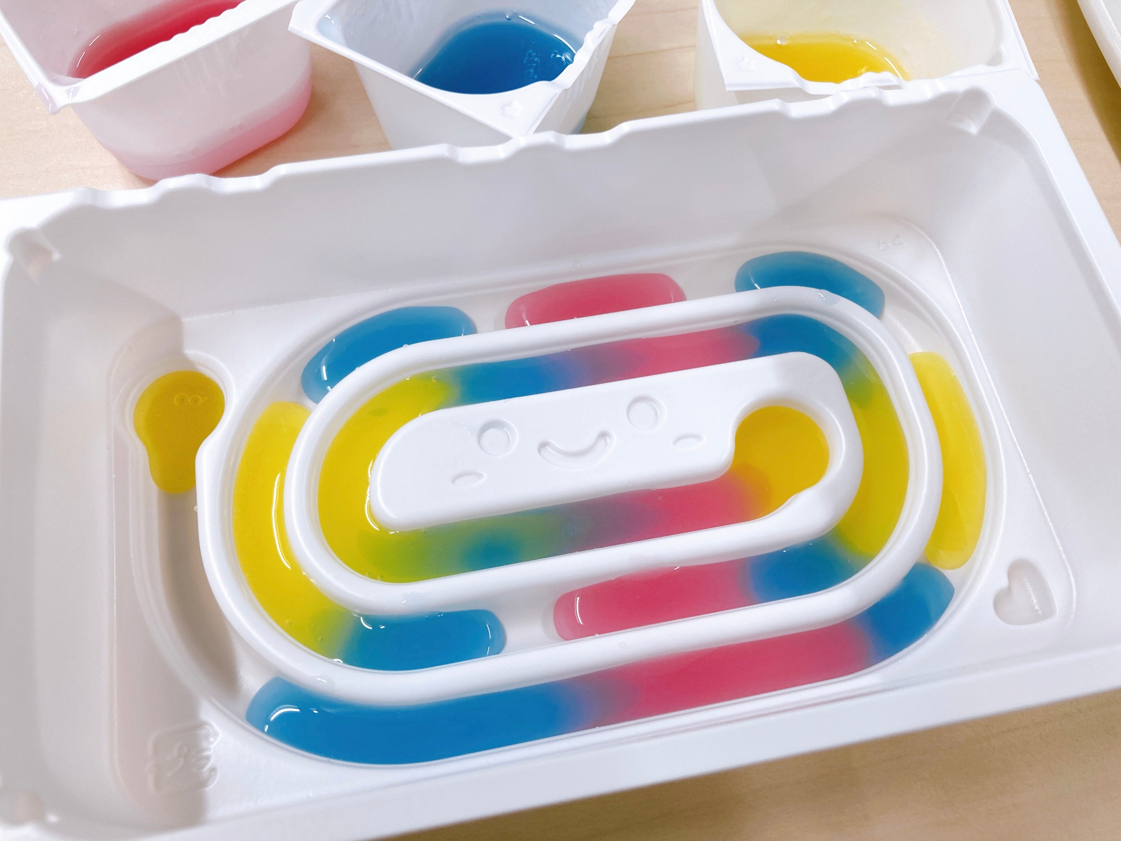 ・赤・青・黄色のグミ液を注ぐだけで、世界に一つの虹色グミが作れる