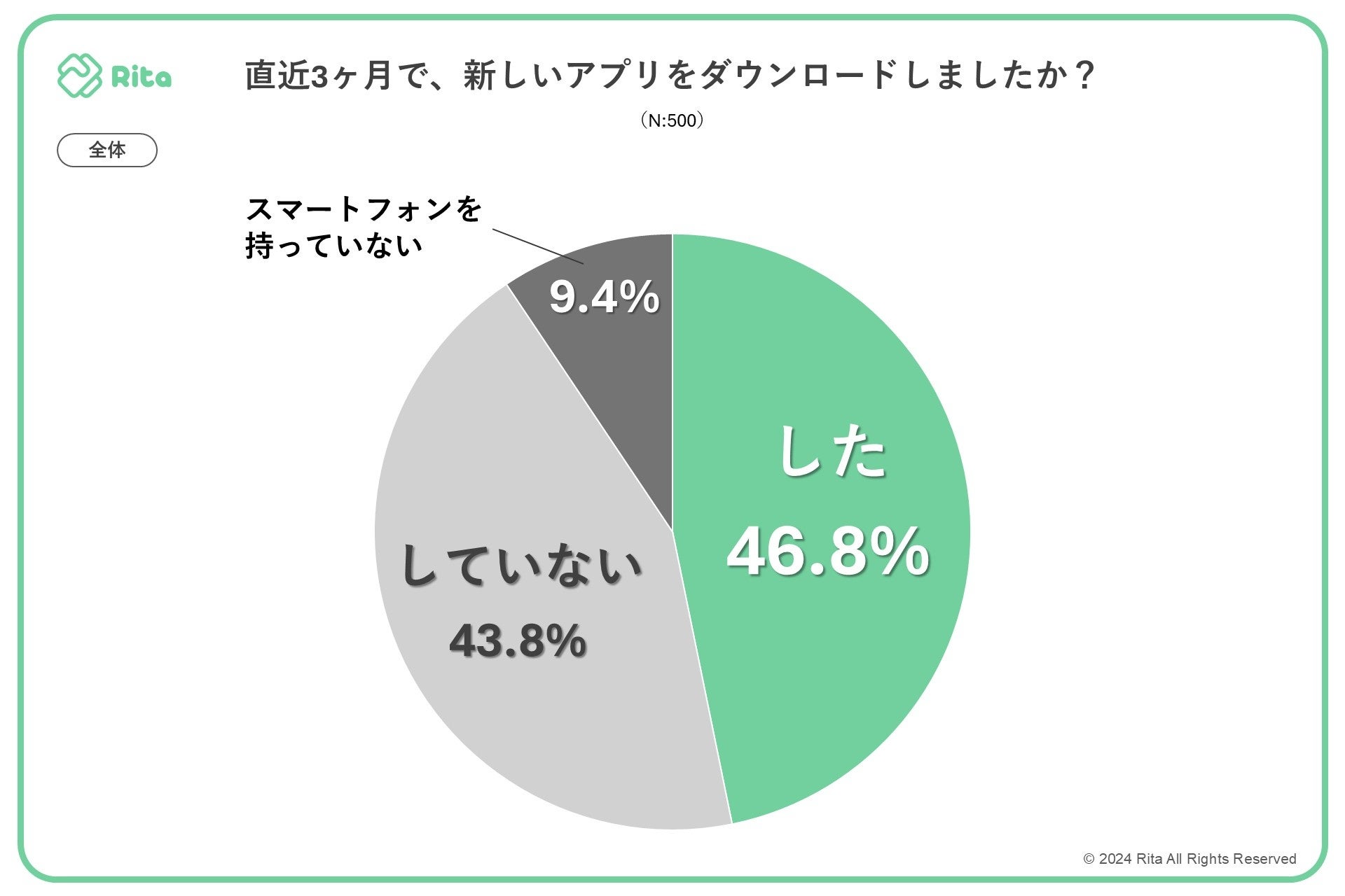 全国の20代〜60代の男女を対象に、「直近3ヶ月で新しいアプリをいくつダウンロードしましたか?」というアンケートを実施したところ、「した」と回答した方は46.8%でした。